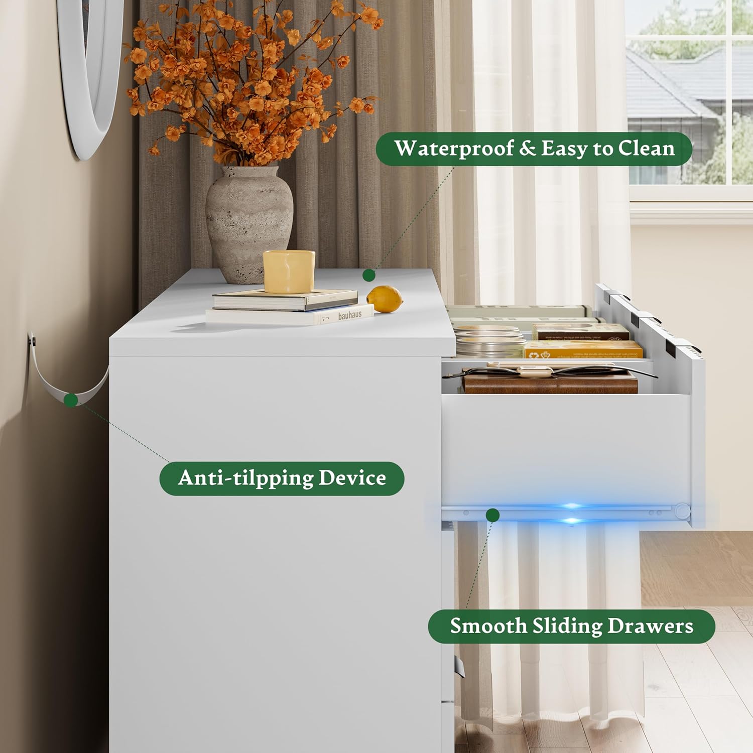 - ăStability & SafetyăThe white/black/oak/grey dresser is equipped with an anti-tipping device, which can be fixed on the wall to prevent accidents. Each drawer contains a wide metal handle and built-in slide rail, easy to push and pull. Besides, the sturdy base provides this dresser with drawers a strong support and the middle feet can be adjustable to keep balance on uneven floors