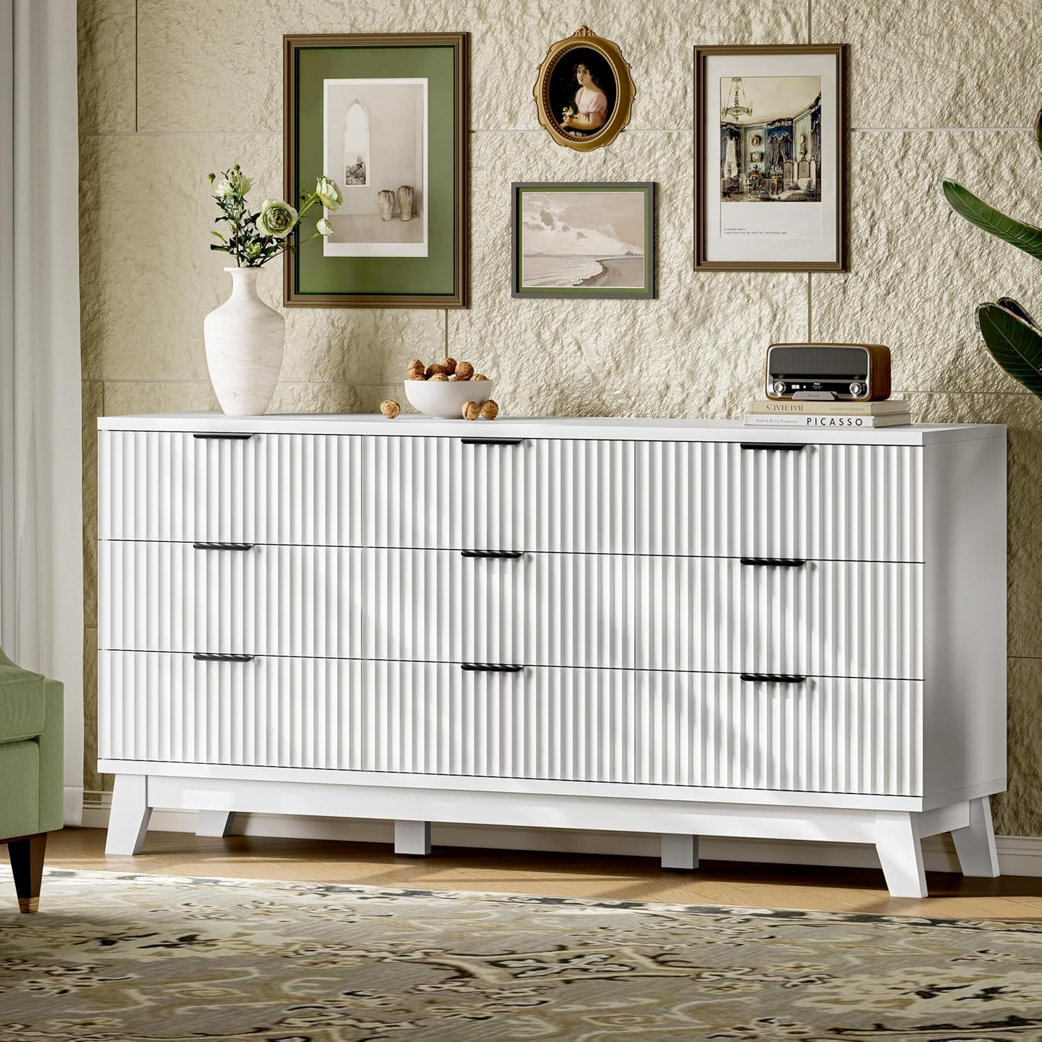 Fluted Dresser with 9 Drawers, 63" Wide Modern Chest of Drawers with Metal Handle, Wooden Dresser TV Stand, Wood Closet Clothes Storage Organizer for Bedroom, Living Room, Hallway, Solid White