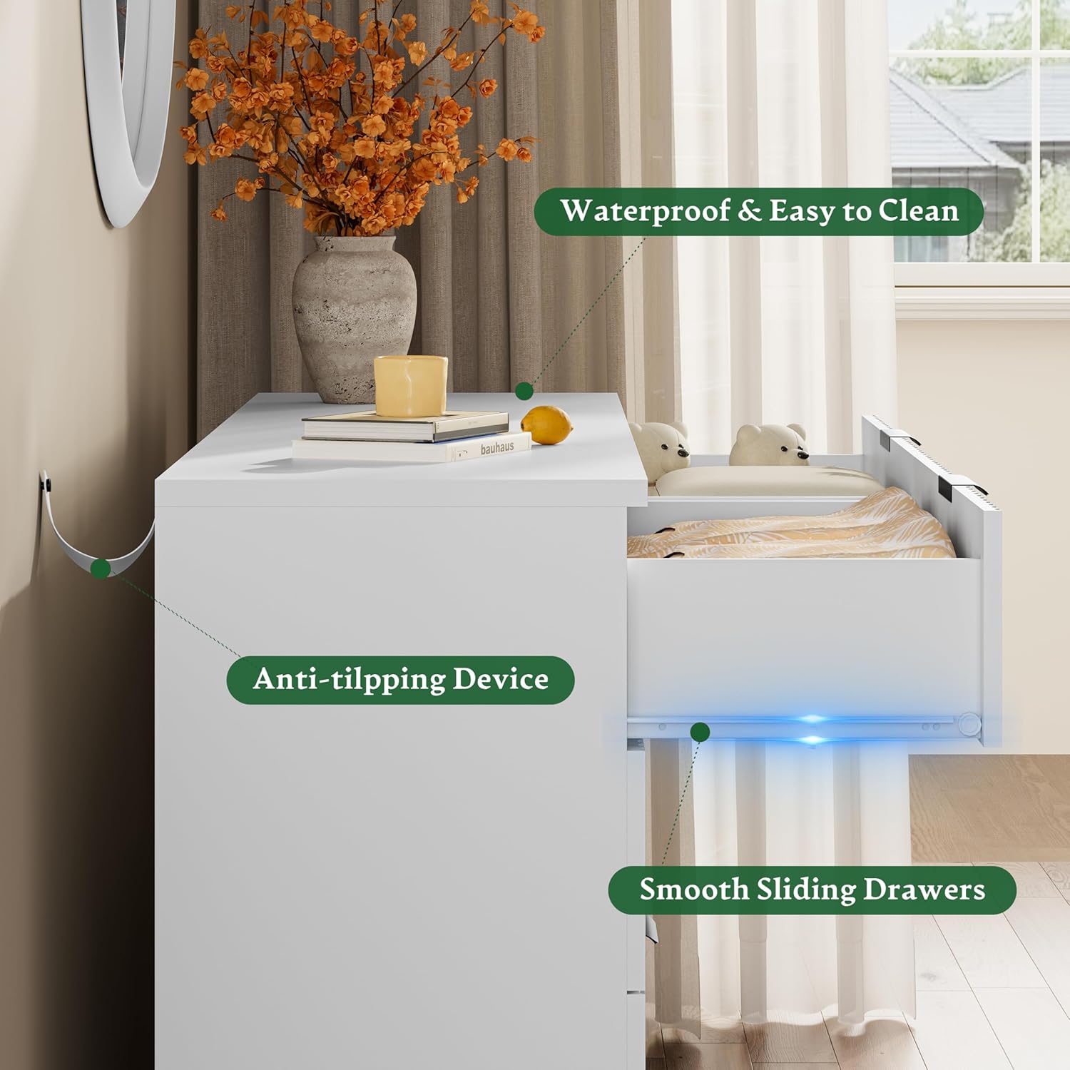 - ăStability & SafetyăThe white/black/oak/grey dresser is equipped with an anti-tipping device, which can be fixed on the wall to prevent accidents. Each drawer contains a wide metal handle and built-in slide rail, easy to push and pull. Besides, the sturdy base provides this dresser with drawers a strong support and the middle feet can be adjustable to keep balance on uneven floors