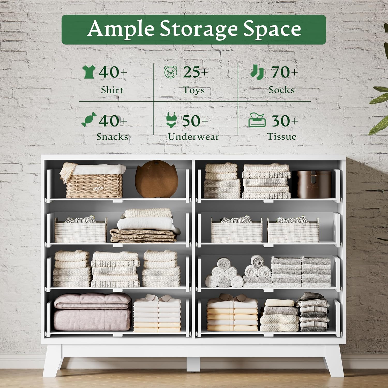 - ăLarge Storage CapacityăThe dresser for closet features 8 deep drawers that provide plenty of room for organizing clothing, bedding, cosmetics, or jewelry, helping you maintain a neat and tidy space. The wide wooden tabletop can serve as a dresser TV stand or display your decorations such as photo frames, plants or mirrors. Perfect for bedroom, living room, hallway, entryway