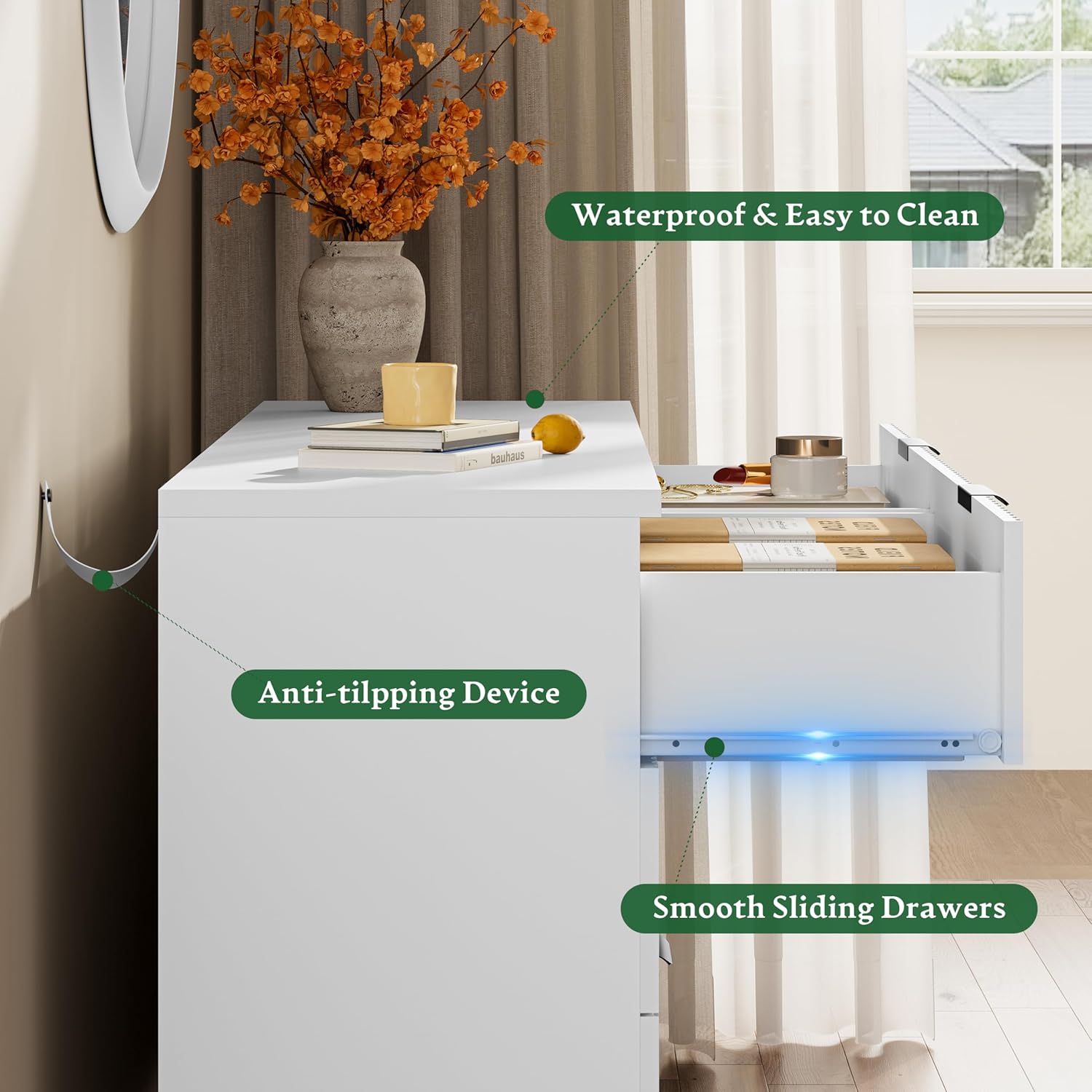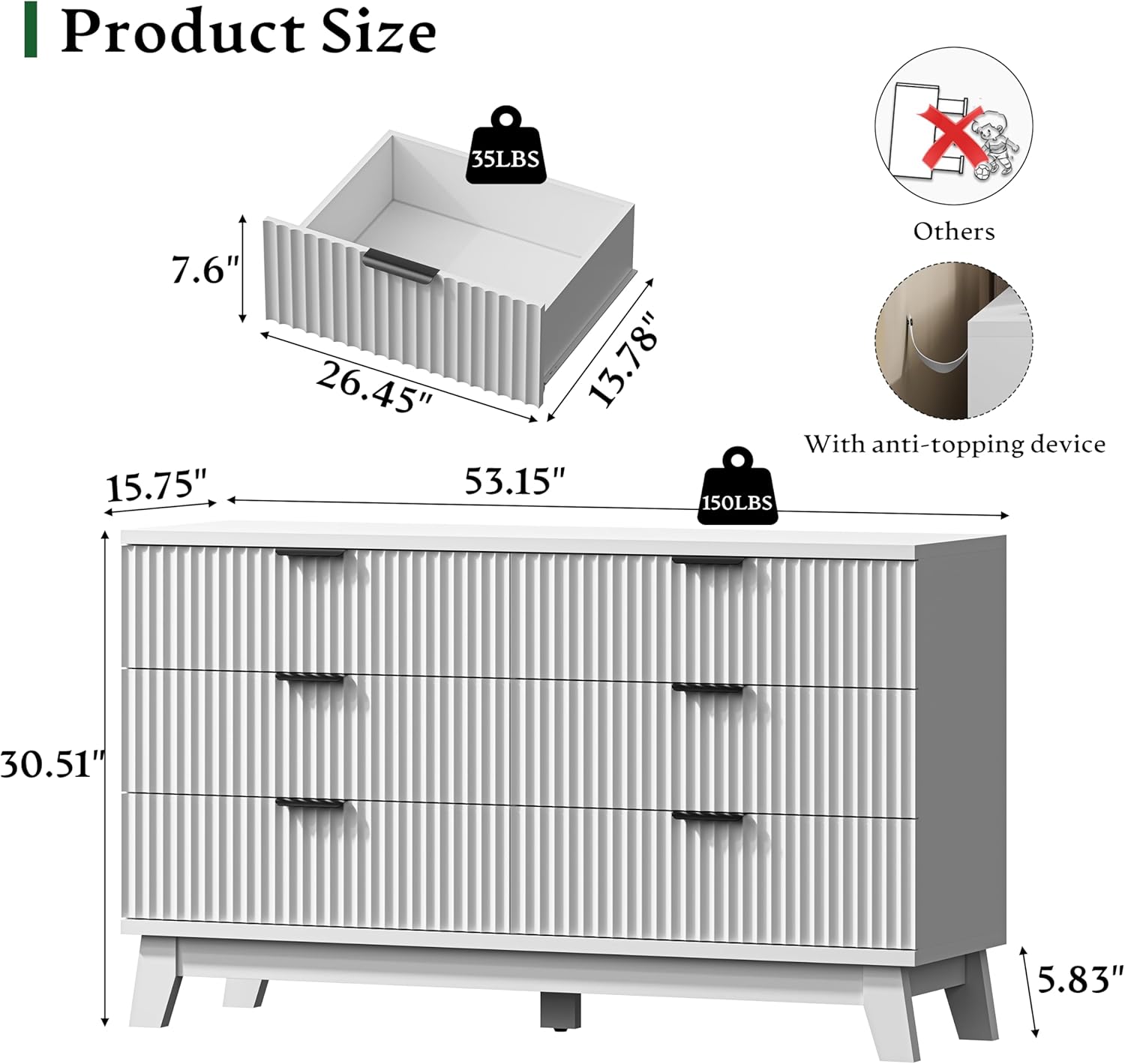 - ăStability & SafetyăThe white/black/oak/grey dresser is equipped with an anti-tipping device, which can be fixed on the wall to prevent accidents. Each drawer contains a wide metal handle and built-in slide rail, easy to push and pull. Besides, the sturdy base provides this dresser with drawers a strong support and the middle feet can be adjustable to keep balance on uneven floors