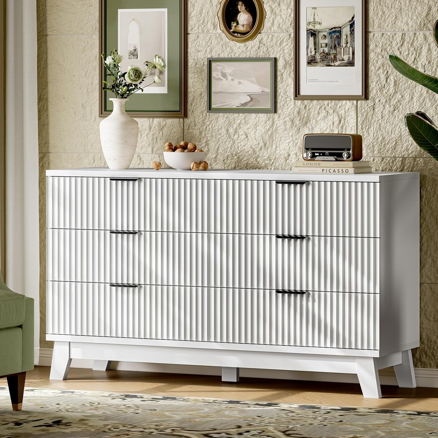 - ăModern Chic AppearanceăThe unique wave-like fluted panel enhances the texture and elegance of this bedroom dresser. The thick table top features natural wood grain that complements the solid white finish. The wide metal handle and splayed base legs add a modern touch, creating a personalized and distinctive appearance