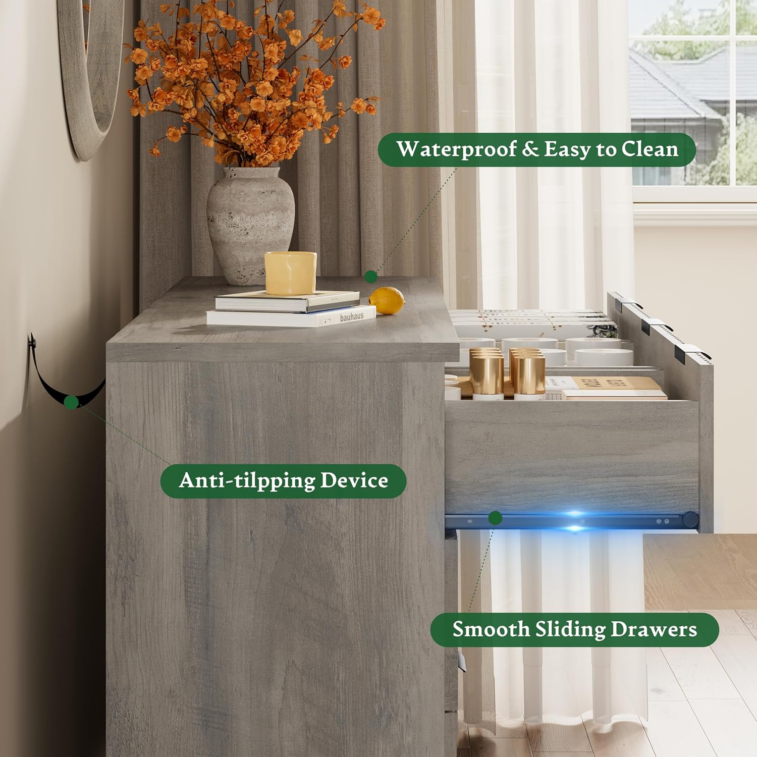 - ăStability & SafetyăThe white/black/oak/grey dresser is equipped with an anti-tipping device, which can be fixed on the wall to prevent accidents. Each drawer contains a wide metal handle and built-in slide rail, easy to push and pull. Besides, the sturdy base provides this dresser with drawers a strong support and the middle feet can be adjustable to keep balance on uneven floors