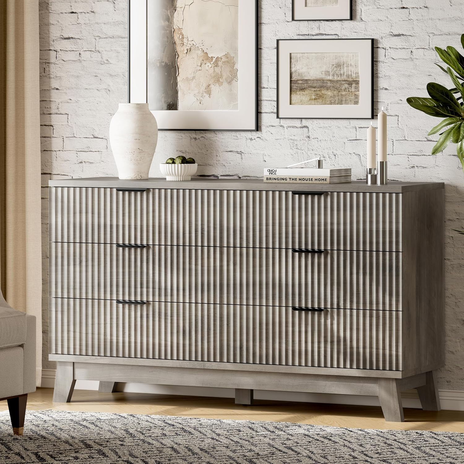 - ăModern Chic AppearanceăThe unique wave-like fluted panel enhances the texture and elegance of this bedroom dresser. The thick table top features natural wood grain that complements the light grey finish. The wide metal handle and splayed base legs add a modern touch, creating a personalized and distinctive appearance