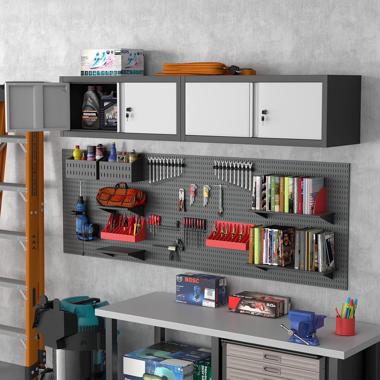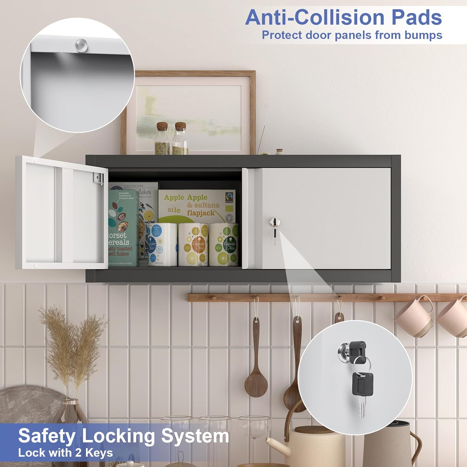 - ăIndustrial Gray & Black FinishăThis metal wall cabinet features a modern two-tone gray & black design that blends perfectly with workshop and garage aesthetics. The powder-coated surface resists rust, scratches, and stains.