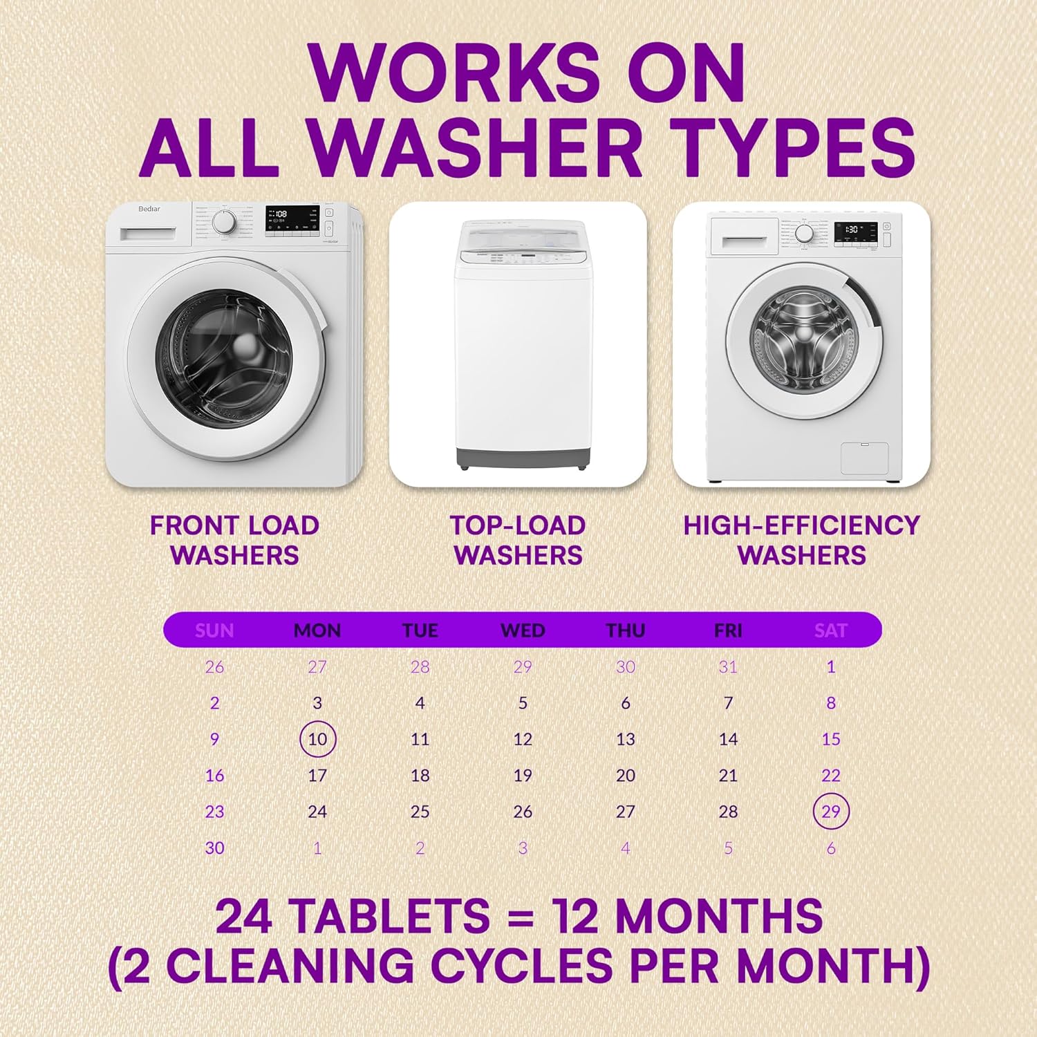 - Bulk 24-Pack: This washing machine cleaner top load set comes in a compact, protective container with 24 tablets. Use one tablet per cycle, twice monthly or as needed, with packaging designed to keep tablets intact without breaking during shipping.