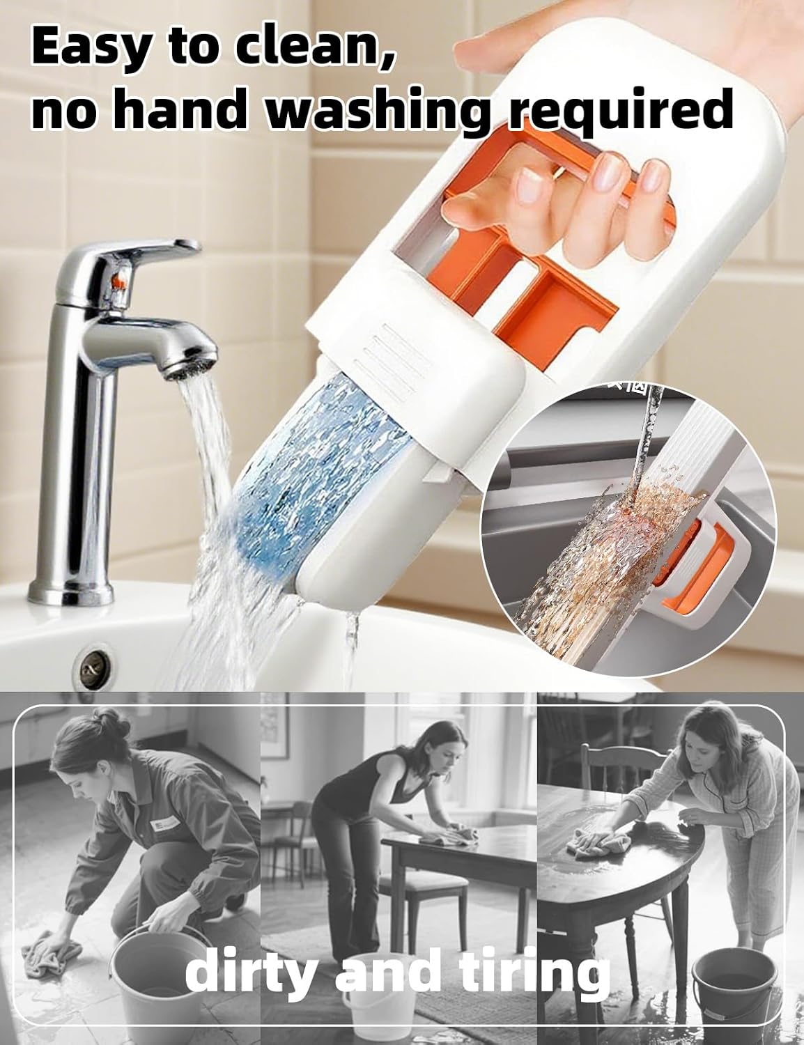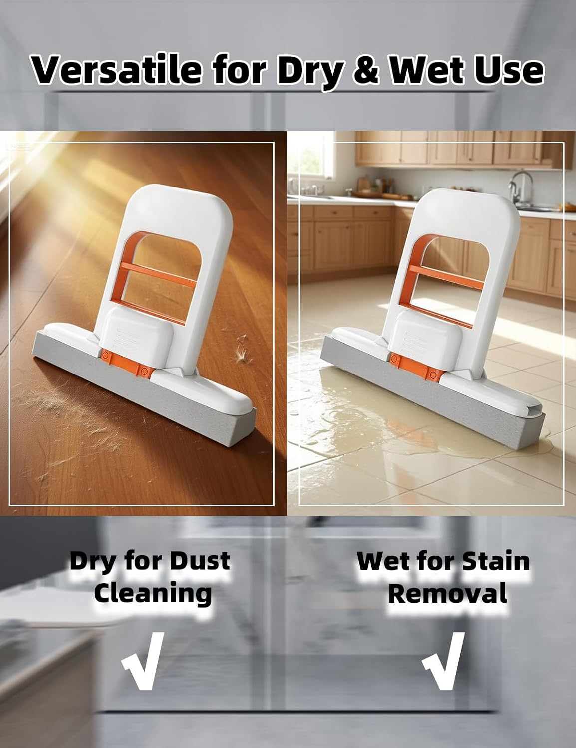 - Hands-Free Self-Squeeze Design: Sponge mop ergonomic handle enables one-hand operation to wring water—no messy hand-washing. Keeps hands clean and dry, reducing strain during wet or dry use for quick cleanups