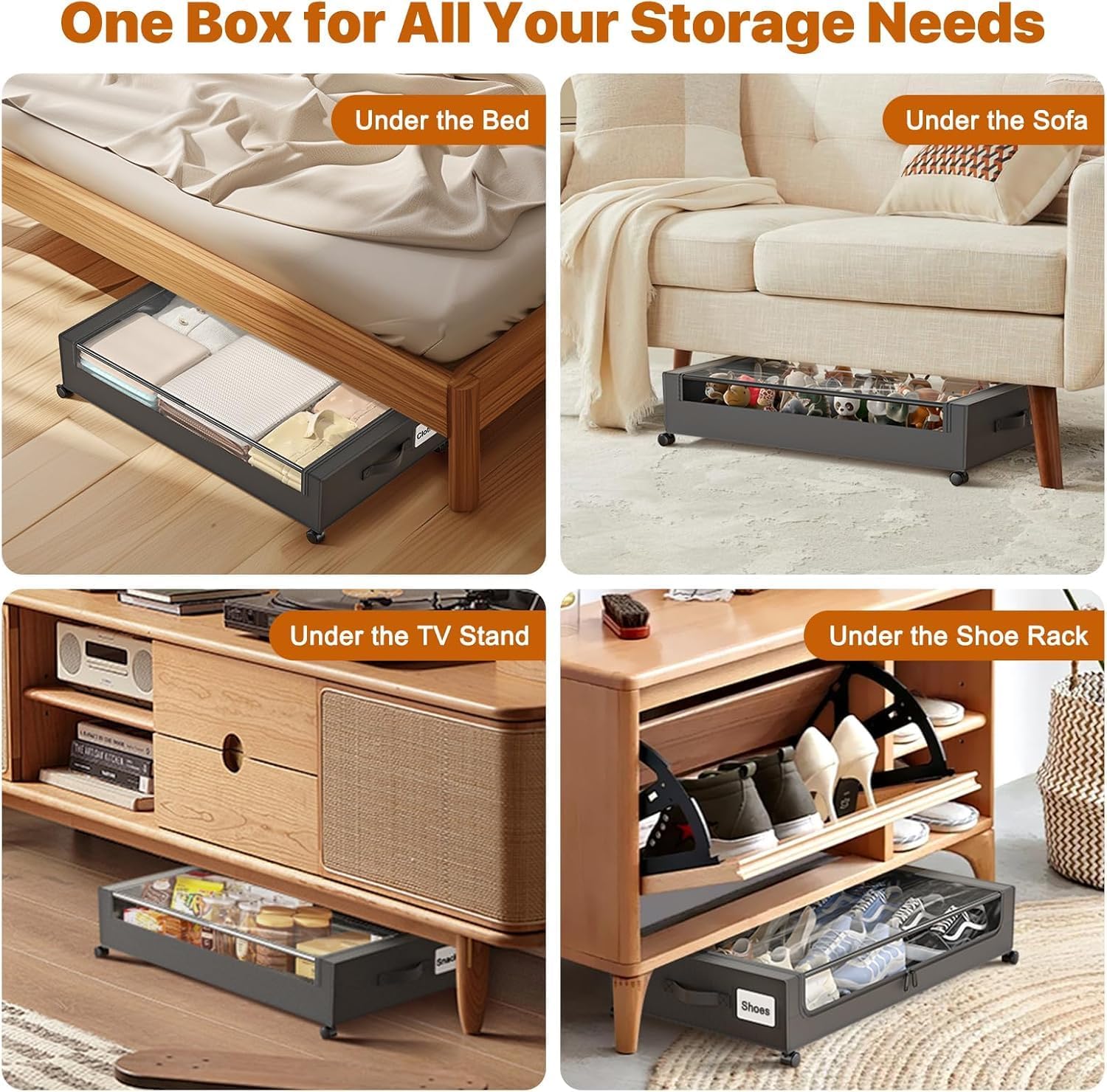 - Transparent Window & Label Design: The rolling under-bed storage bins feature transparent lid windows and label slots, making it easy to identify contents without opening multiple containers. This design helps prevent misstorage and ensures you can quickly locate items. The double zipper bottom and high-quality material keep dust, moisture, and dirt out, keeping your items clean and organized.