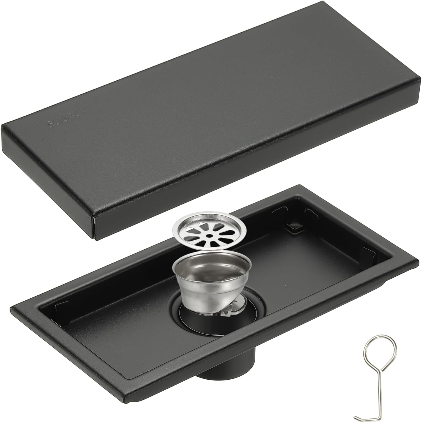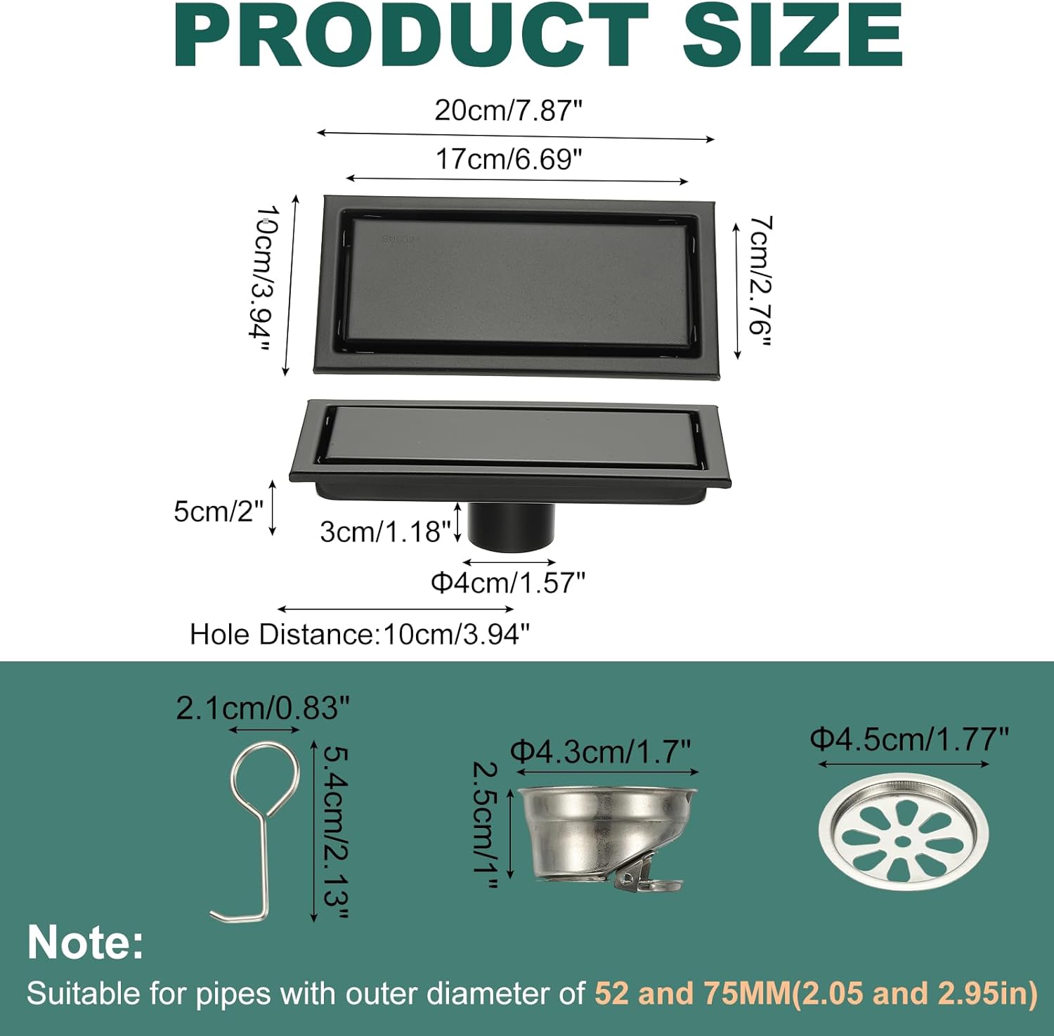 uxcell Rectangular Shower Drain, Brushed 304 Stainless Steel Odor-Proof Floor Drain Linear Shower Drain Hair Catcher for Bathroom Kitchen and Laundry Room(8 Inch, Black)