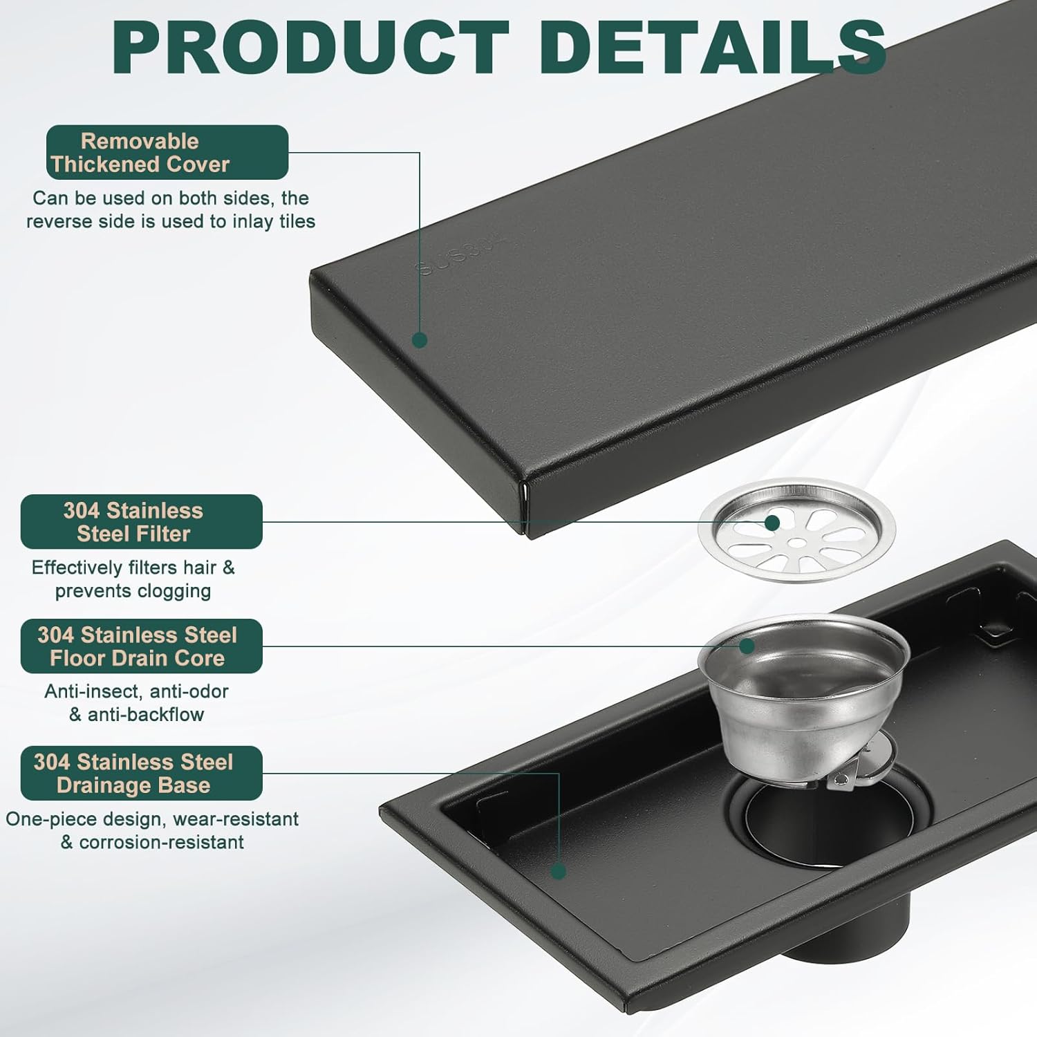 - High-Capacity Drainage System - This rectangular shower drain features a collection area 3X larger than standard drains, enabling powerful, clog-resistant water flow for faster drainage. The expanded surface area prevents water pooling, keeping floors dry and safe even during heavy shower use.