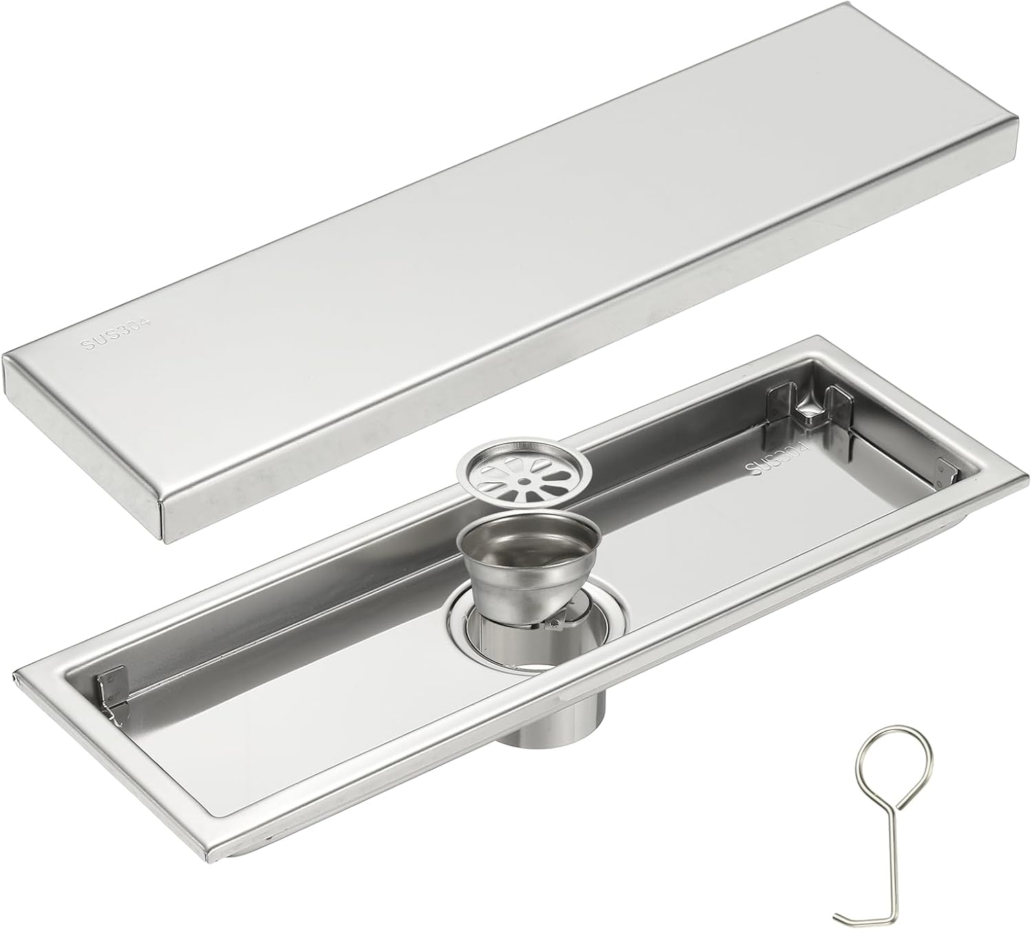 uxcell Rectangular Shower Drain, Brushed 304 Stainless Steel Odor-Proof Floor Drain Linear Shower Drain Hair Catcher for Bathroom Kitchen and Laundry Room(12 Inch, Bright Silver)