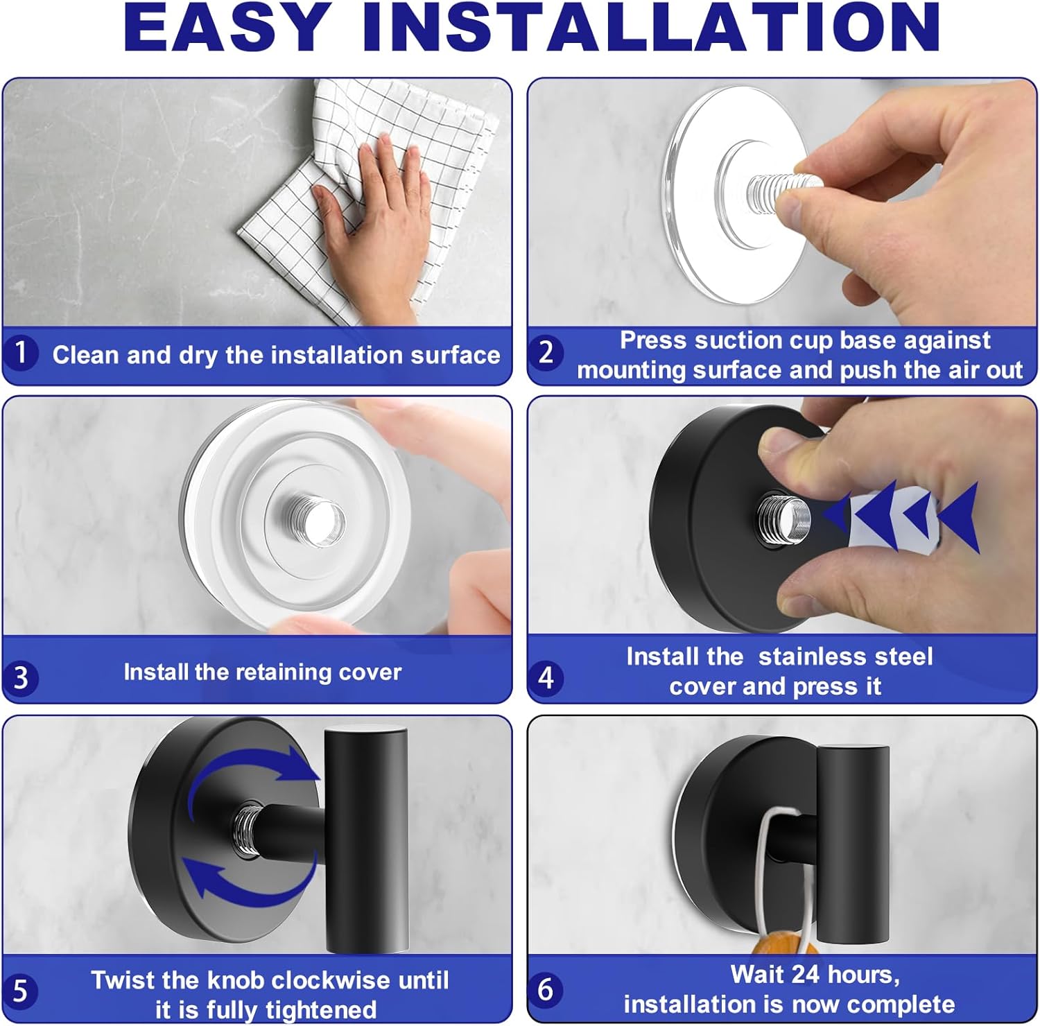 - [Effortless Setup in 3 Steps]: 1. Clean & Dry a smooth, non-porous surface; 2. Loosen the hook counter-clockwise, take out the suction cup base; 3. Press the base against the surface and twist the knob clockwise until fully tight. Watch our video for detailed instructions.