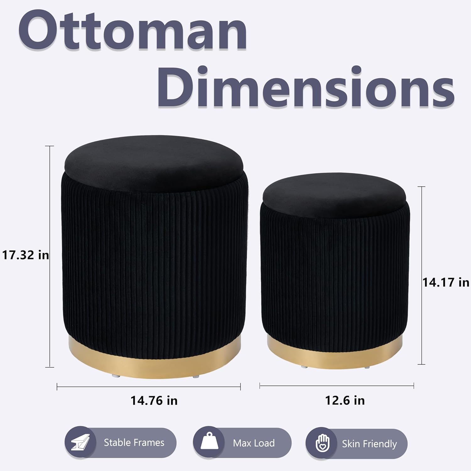 Royal Windsor Round Ottoman with Storage Set of 2, Vanity Stool with Storage for Bedroom, Ottoman Coffee Table Gold-Tone Ring Around The Base, Small Velvet Foot Stool for Living Room, Black