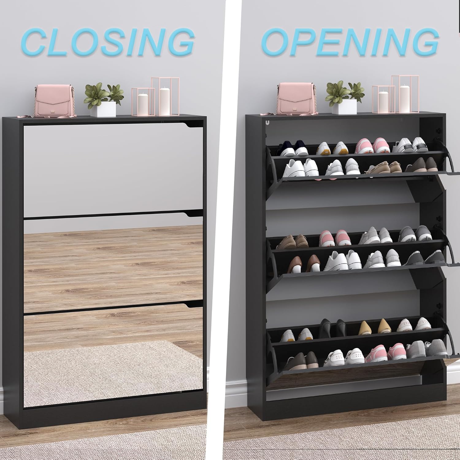 - Shoe Cabinet with Mirror for Entryway: BORNOON narrow shoe cabinet features a spacious full-length mirror, perfect for a quick outfit check before heading out. It combines practicality and style, making itβs easily to select your shoes and get a final look at your outfit. Placed conveniently near your entryway, hallway or it enhances your daily routine with both function and fashion.