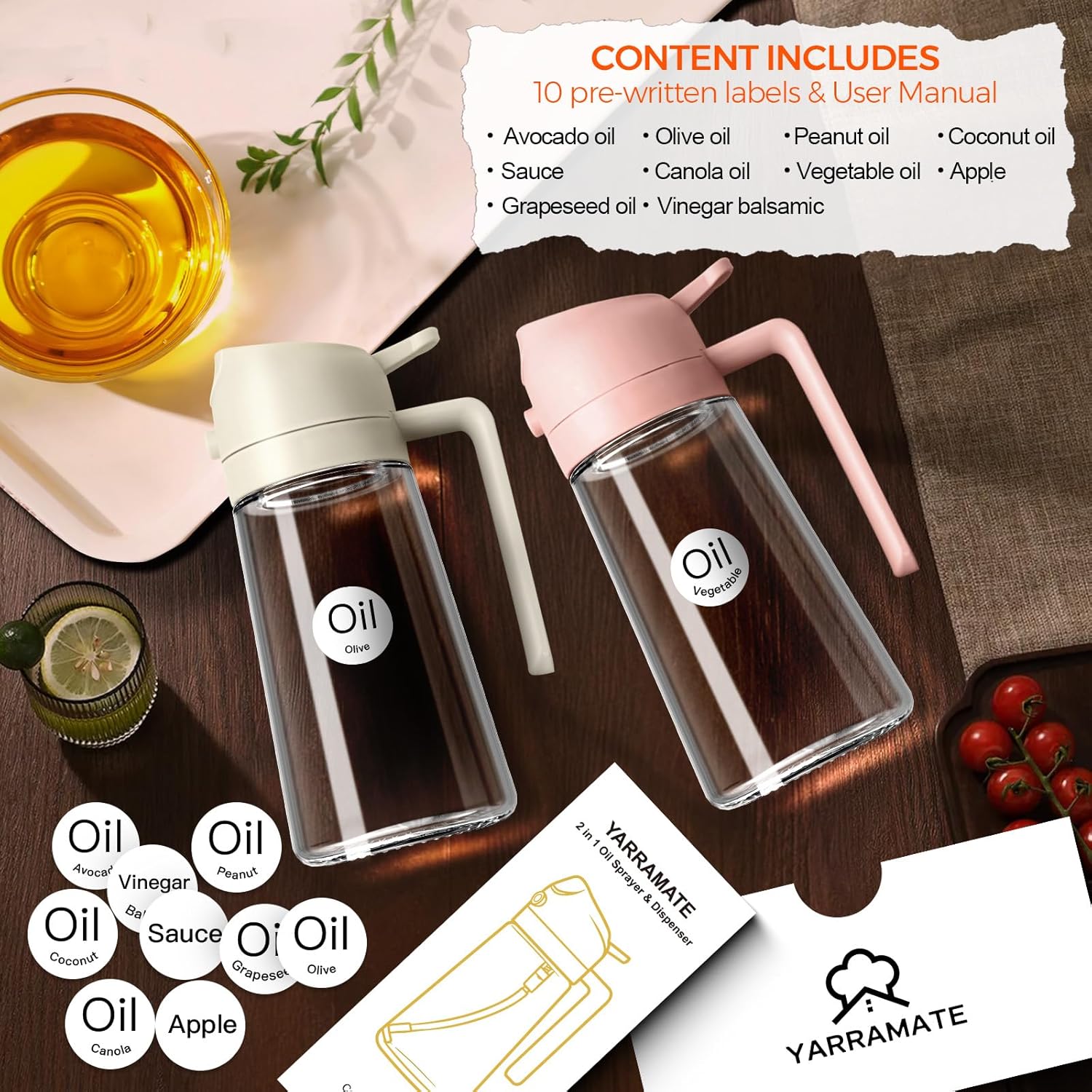 YARRAMATE 16oz/470ml Glass Olive Oil Sprayer for Cooking with Stickers, 2 in 1 Oil Dispenser for Kitchen Gadgets, Food Grade Premium Spray Bottle for Salad, Frying, BBQ (PeachPink)
