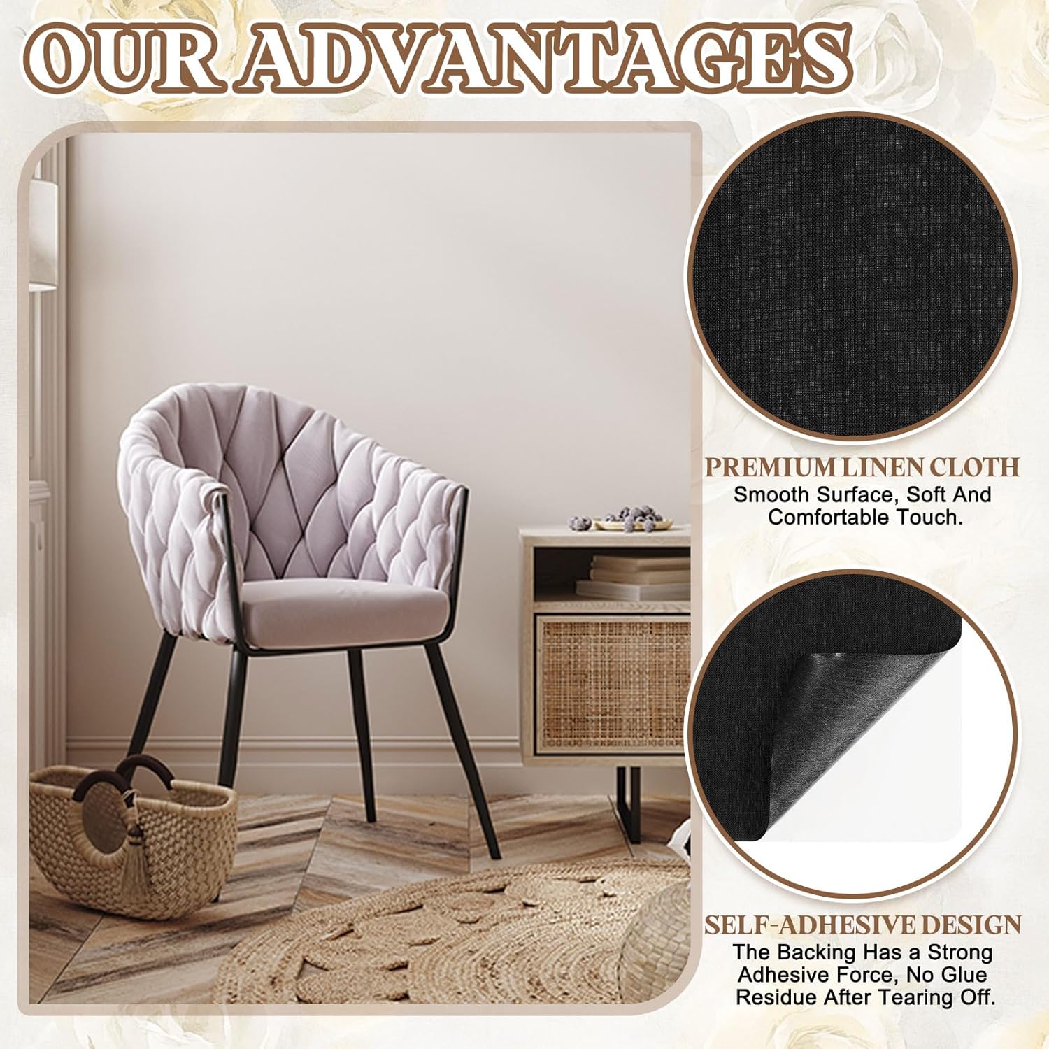 - Application: This self-adhesive linen patch is very suitable for various home and car scenes, such as repairing furniture such as sofas, tables and chairs, clothes, backpacks, handbags, car seats, etc. It can be used for various home crafts and decorations, and can also be used for outdoor tents, sails, hammocks, sleeping bags, outdoor furniture covers, luggage bags, etc