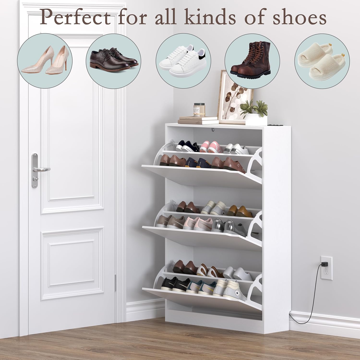 - Shoe Rack Cabinet with Adjustable Shelves: BORNOON shoe organizer cabinet features three flip-top drawers, each with two adjustable levels. The center divider in each drawer can be adjusted or removed to fit various shoe sizes, accommodating up to 18-24 pairs. The top surface provides ample space for storing picture frames, keys, wallets, making it both functional and stylish for your entryway.