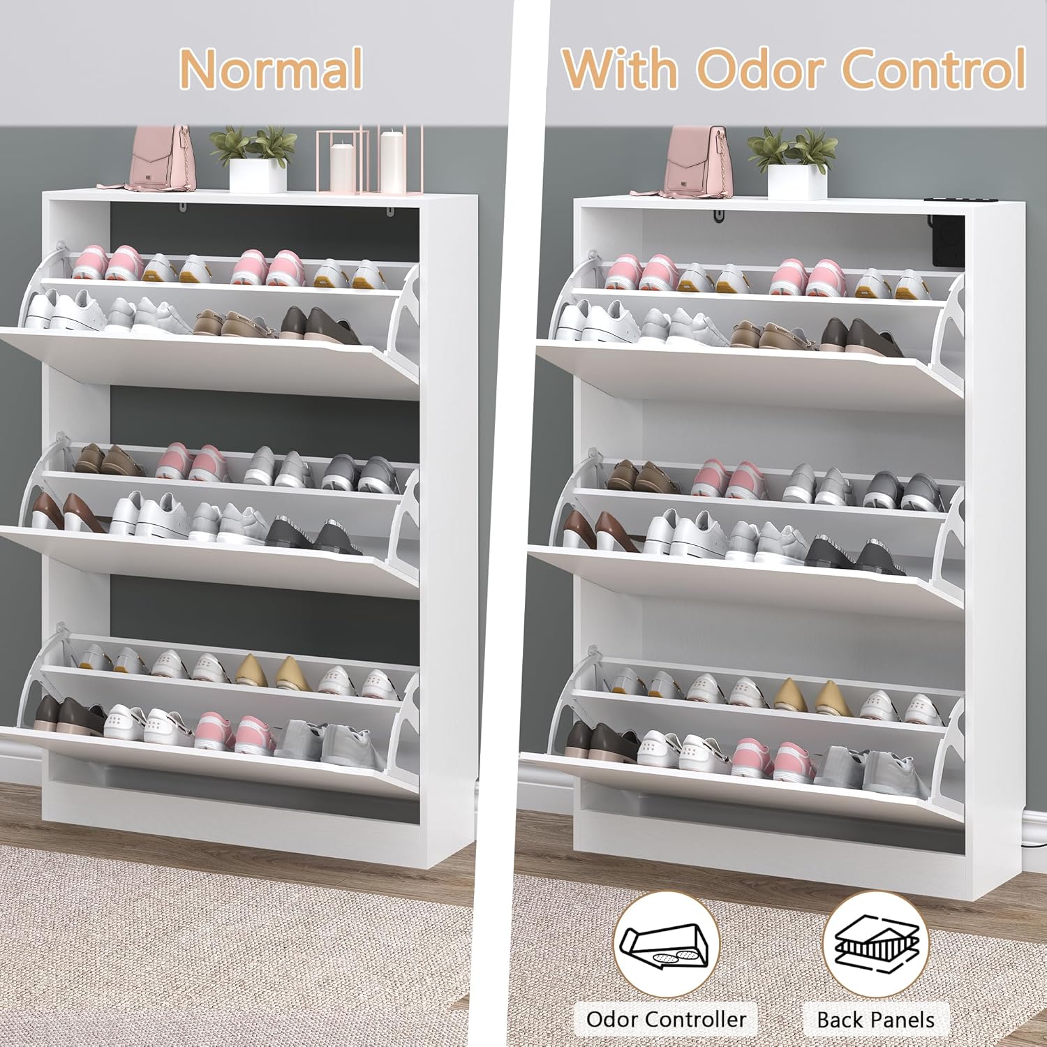 Shoe Cabinet with Odor Control and Back Panels, Deodorizing Slim 3-Flip Shoe Storage Cabinet for Entryway, Freestanding Hidden Shoe Rack Organizer for Entrance, Hallway, Bedroom