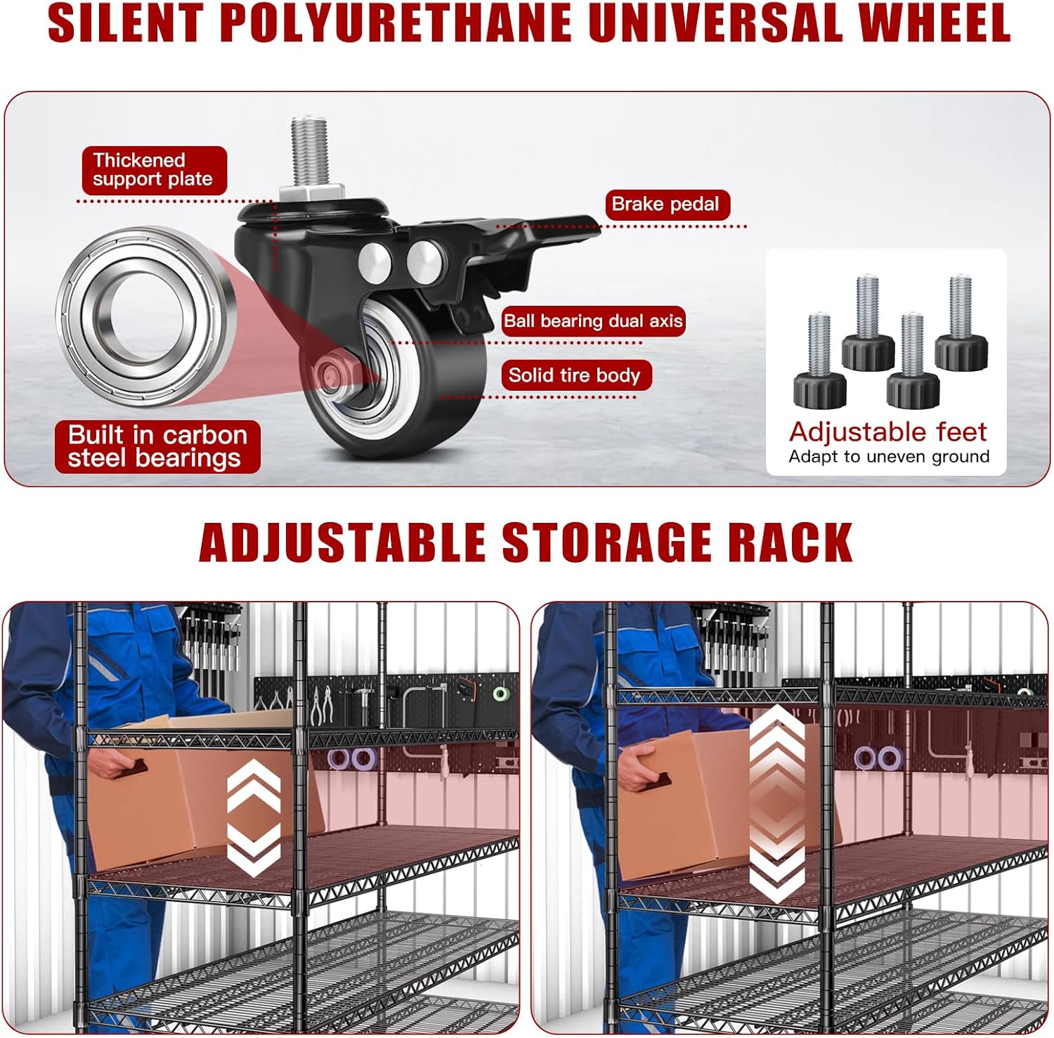- Shelving Unit With Wheels - Four brakes for more stability: Garage shelving comes with four universal bearing wheels with brakes and four leveling feet. You can choose the right leveling feet based on your usage scenario and storage items. The maximum load-bearing capacity of the product is designed to use leveling feet as the base. To ensure the long-term durability and ease of pushing of the product, please do not exceed a total load of 800 pounds when installing casters.
