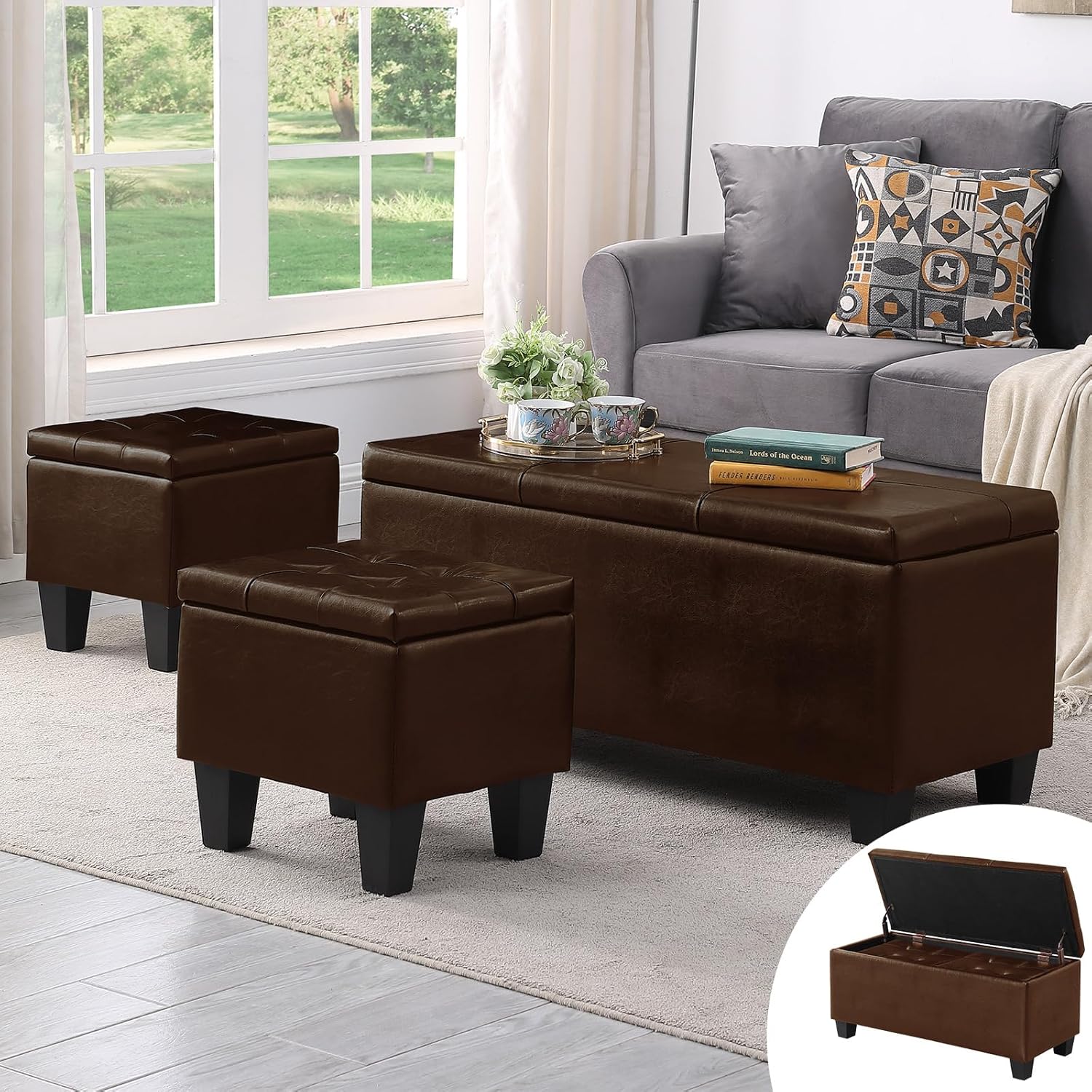 Ottoman with Storage Set of 3, 38'' Button Tufted Storage Ottoman with 2 Stools, Easy Open & Close w/Safety Hinges, Extra Seating Foot Rest for Living Room (Brown - PU Leather)