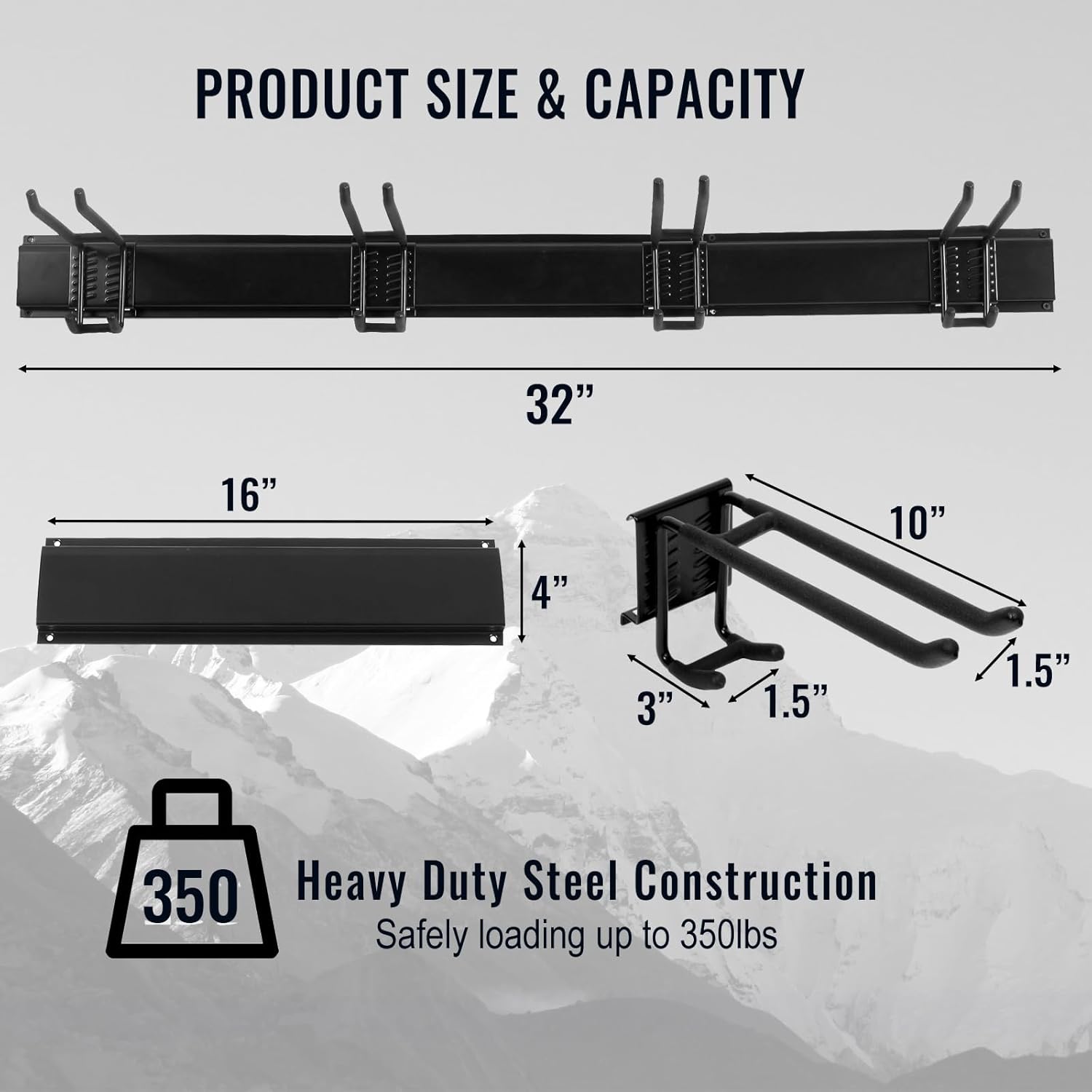 - MULTI-FUNCTION STORAGE RACK: Perfect wall mount garage tool organizer storage system, superb organization for garden tools, brooms , hoses , Yard Tools , pole cutters , hockey sticks , ski gears and more.