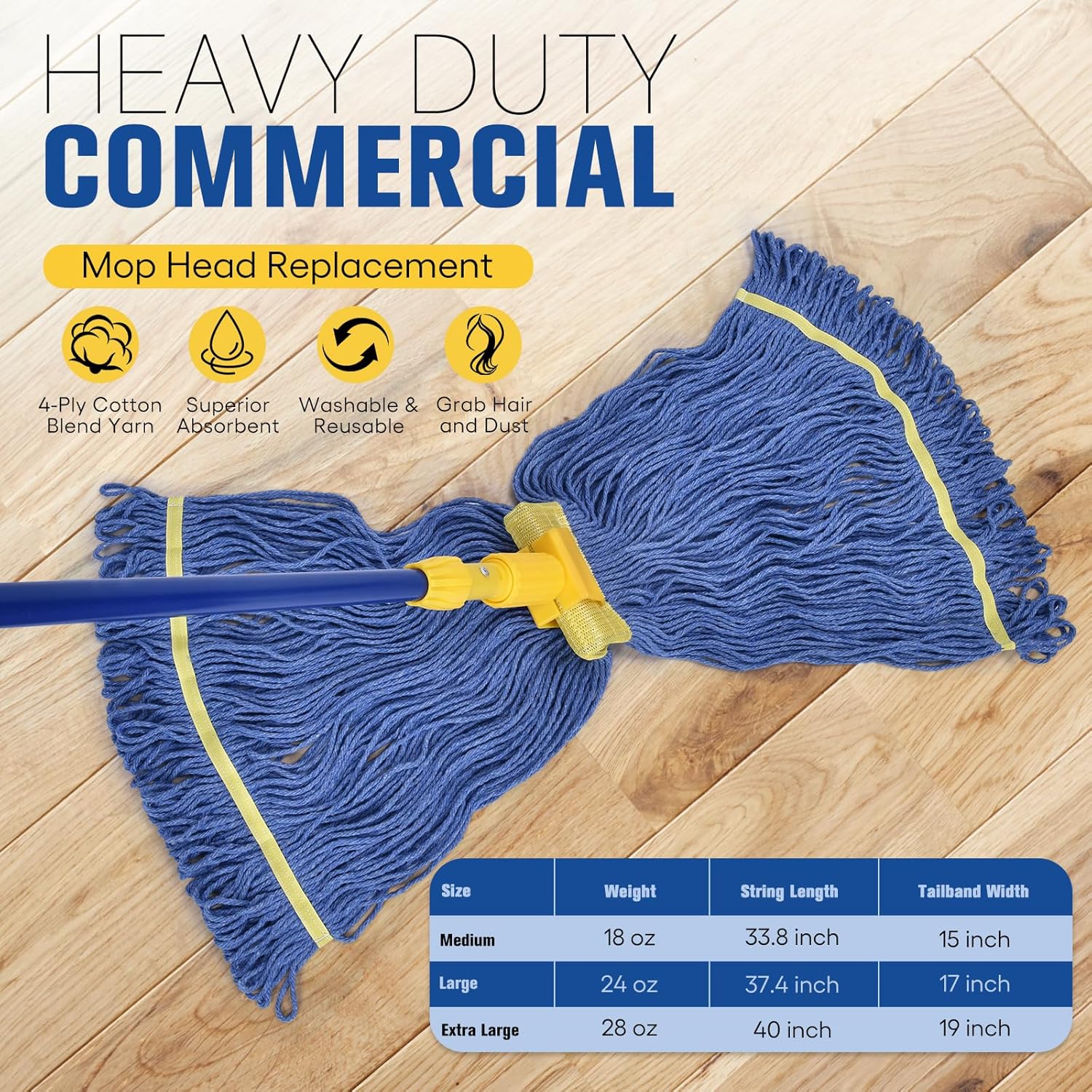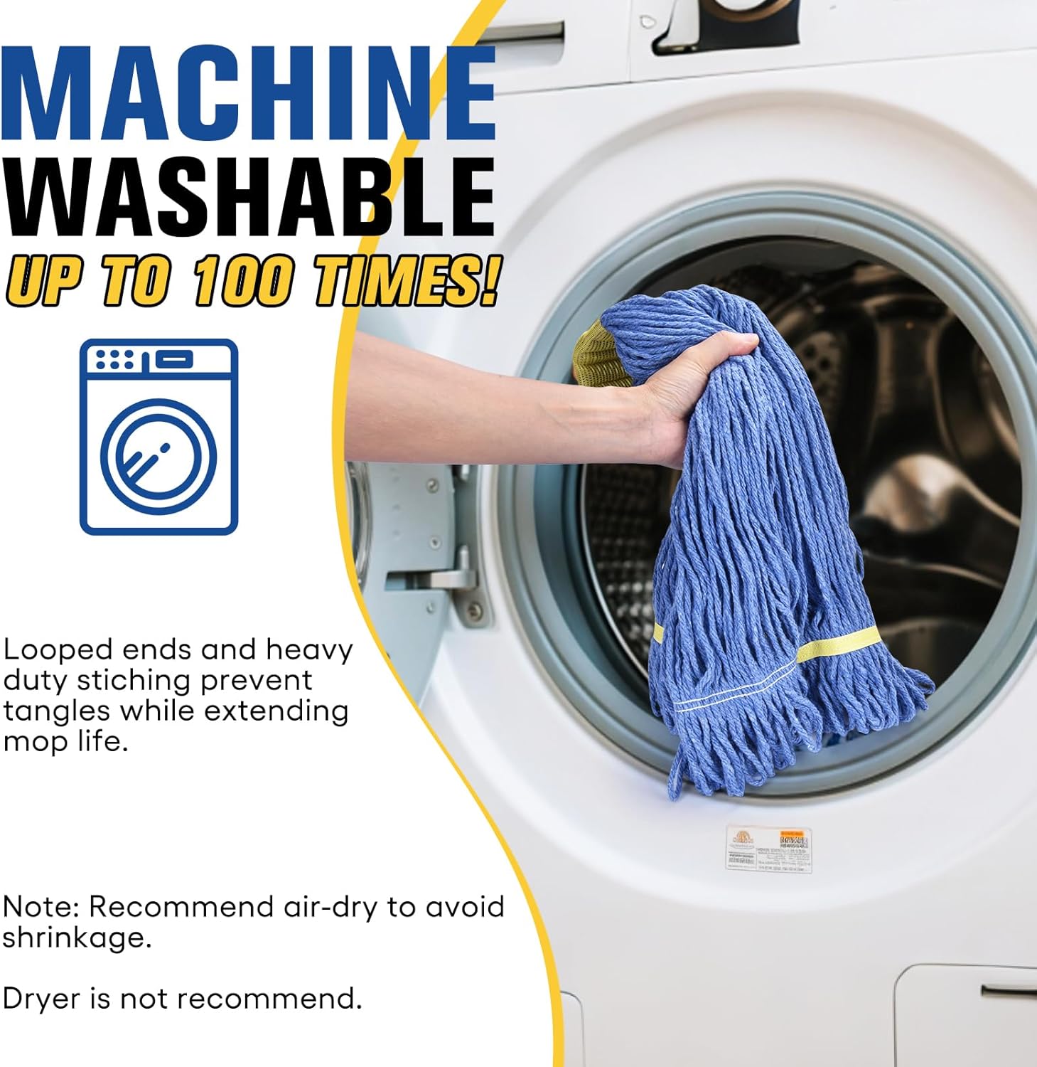 - Washable and Long-Lasting: Commercial mop heads are launderable for extended long-term usage. Long-lasting fibers allow the mop head to be washed many times giving it a longer service life. This washable mop head is launderable up to 100 times! NOTE: Do not use dryer after laundering to avoid shrinkage and loosen string, air-drying is recommended.