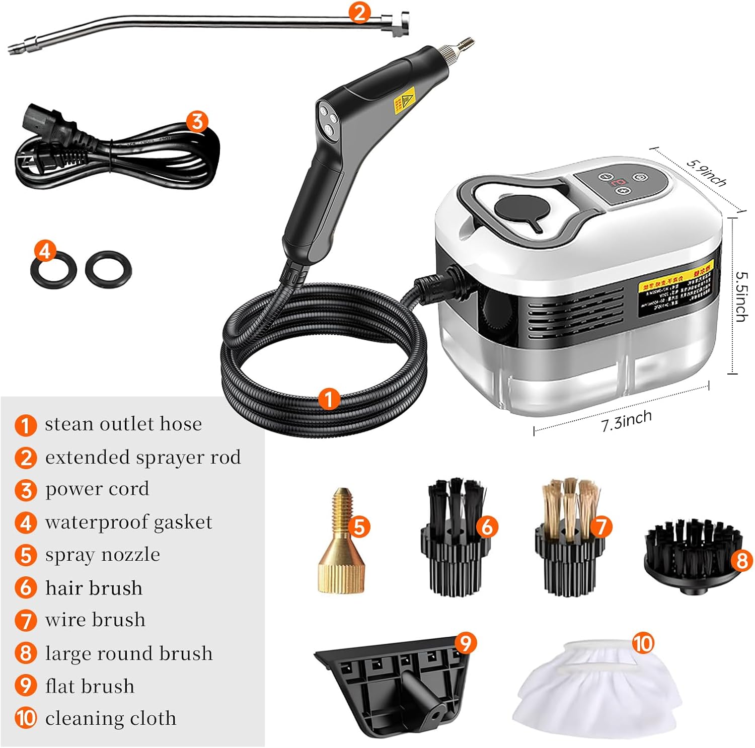 - 【Multi-function Steam Cleaner & Multiple Accessories Set】:This steam cleaner handheld comes with a thick steam hose, which increases the steam output strength for a more thorough cleaning. Package list: 1*Steam machine with tank, 1* power cord, 1* steam pipe, 1* large plastic brush, 1* small plastic brush, 1 steel brush, 1* extension rod, 2*gasket, 1*Flat brush, 1*Cleaning Cloth Sleeve, 1* user manual. if you receive any questions about the product, please contact us promptly