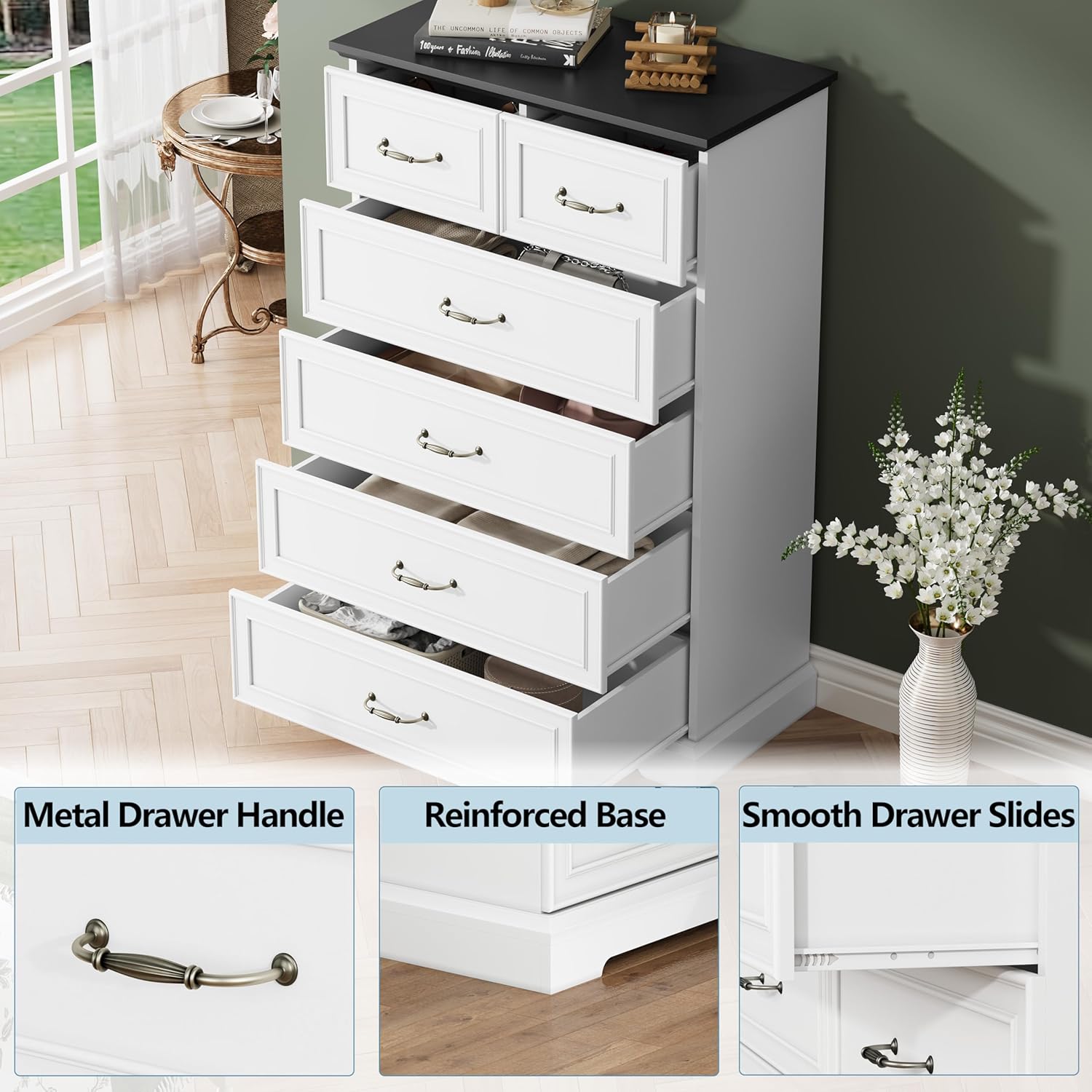- Durable & Stable Construction: Crafted from high-density engineered wood, this sturdy piece is built to last. Strong legs and a thick top support up to 180 lbs. For added safety, an anti-tip device on the back panel keeps the dresser secure, making it a reliable storage solution for any room.