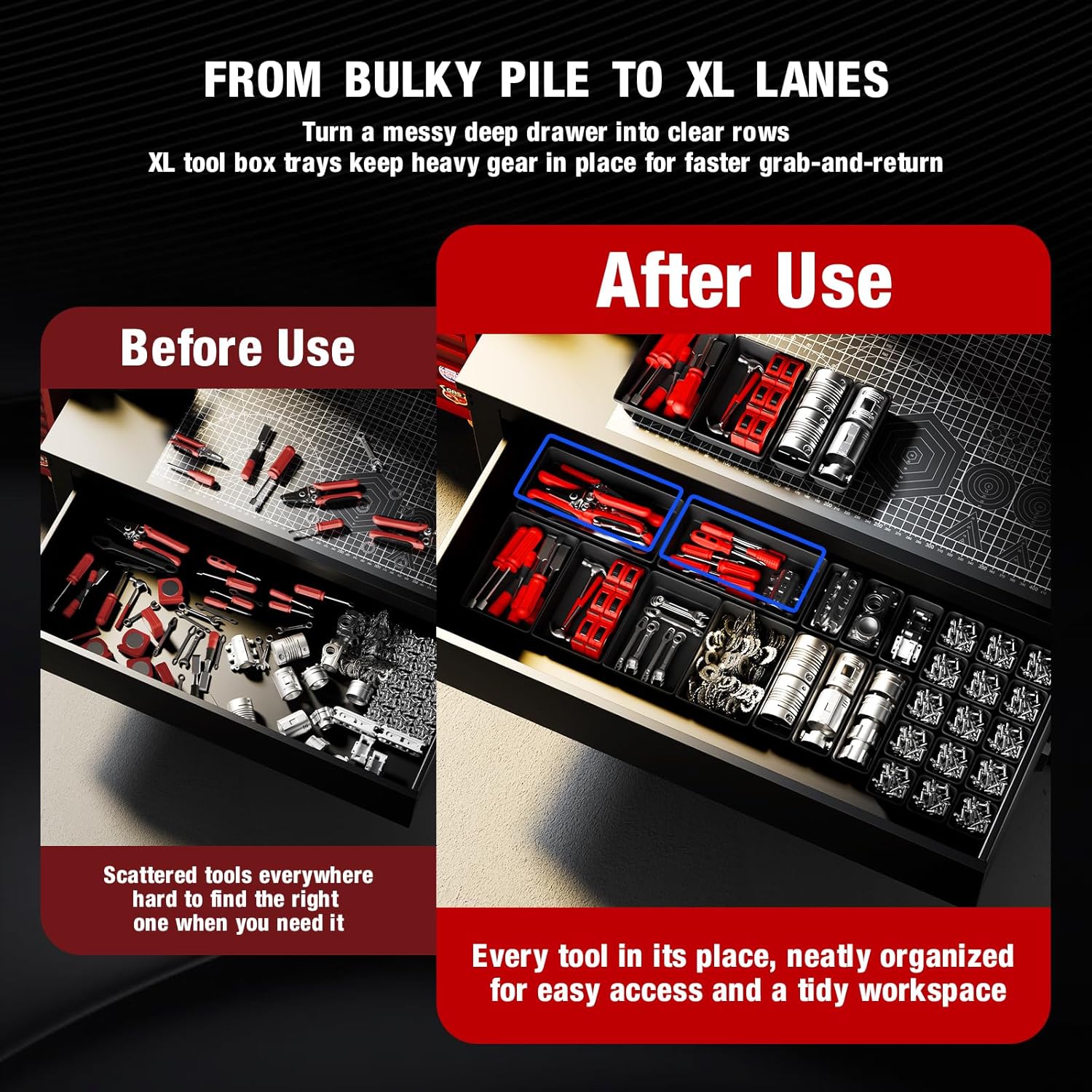 - 【6 XL Trays for Large Tools & Equipment】Set includes 6 X-Large trays (12"x6"x2"), ideal for power tools, ratchets, sockets, hammers, drills, and other bulky hardware. Works as tool box organizers and storage, fits tool chest drawers, garage cabinets, or rolling tool chests.