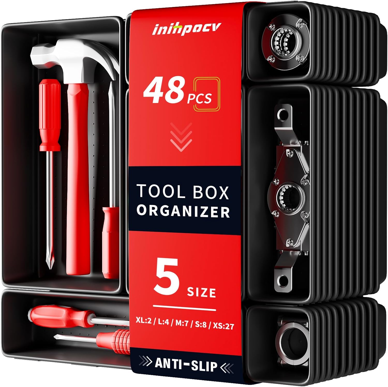 【48PCS & 5 Sizes】Tool Box Organizer Tray, Toolbox Drawer Organizer with Non-Slip Pads, Desk Drawer Divider Set, Fits Rolling Tool Chest Cabinet for Garage & Workbench