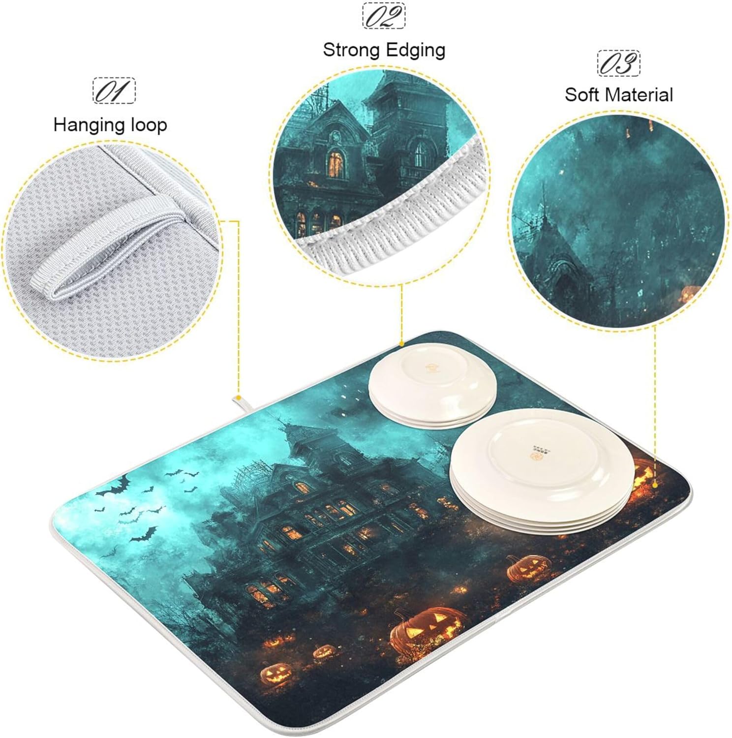 Halloween Castle Dish Drying Mat for Kitchen Countertop 16x18 Spooky Witch Pumpkin Lantern Small Drying Mat Reusable Quick Dry Dish Sink Mats Easy Clean Decorative Essentials