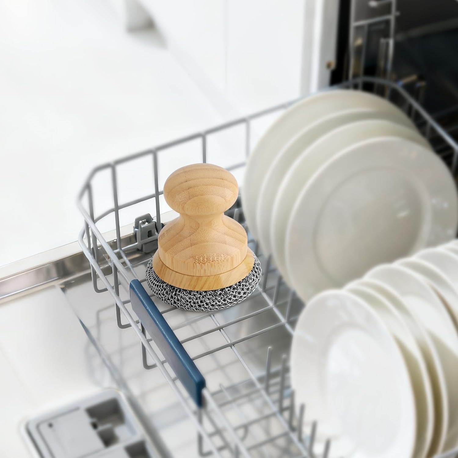 - Durable Chainmail Base with Built-in Silicone Pad: Cast iron cleaner features a stainless steel chainmail structure wrapped around the base, more rust-resistant and robust than traditional wire brushes, and the steel wire won't come loose