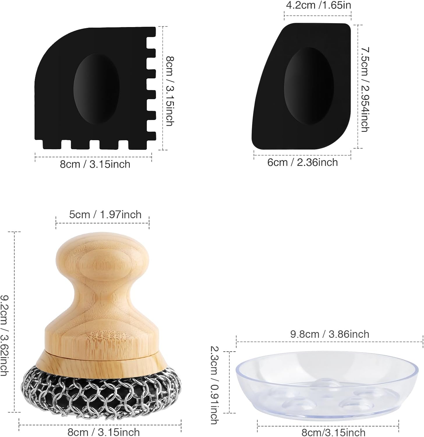 - Easy to Clean: The scrubber helps to effortlessly clean all cast iron cookware pans, just add some warm water and scrub any residue which is easy and quickly and easily. After cleaning, the scrubber and scraper can be cleaned in the dishwasher or by hand,and placed it on the draining tray to dry.For optimal storage, please ensured that they are thoroughly dried before storing