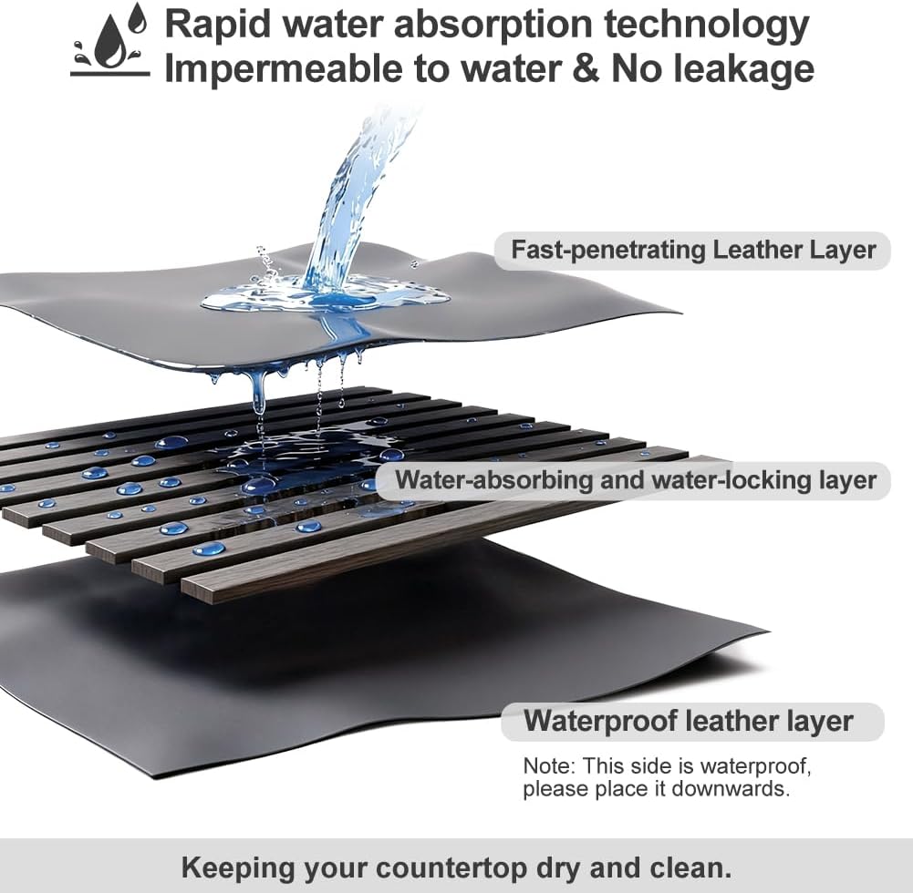 - 【WATERPROOF BOTTOM, NO WATER TRAPED】The upgraded stone drying mat comes with a PU leather cover, which has a water absorbing function on the surface and a waterproof bottom, effectively preventing water from exposing from the bottom and soaking the kitchen countertop