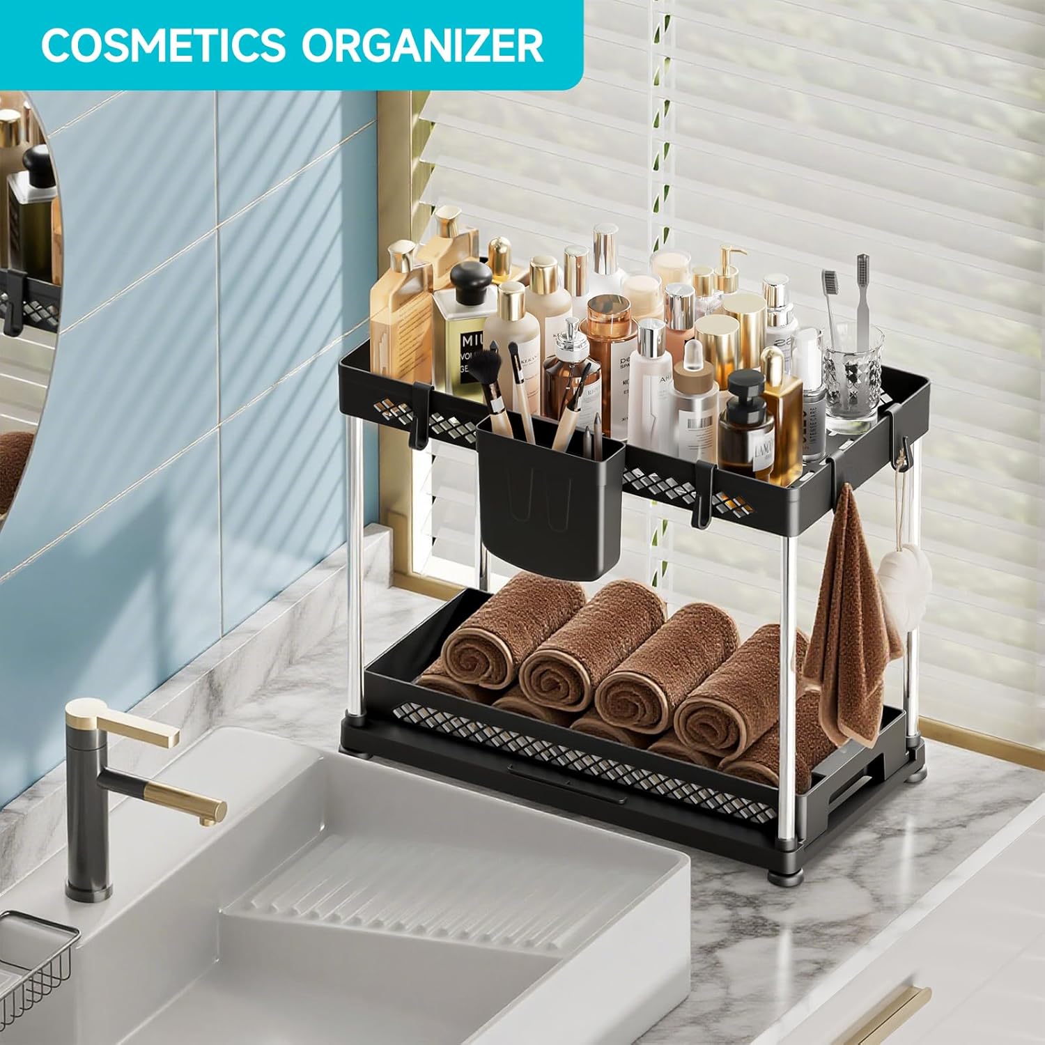Under Sink Organizer, 2 Tier Pull Out Cabinet Organizer with Hooks Hanging Cup, Easy Installation & Rust-resistant, Multi-Purpose Storage Shelf for Kitchen Bathroom Pantry (Black,1 Pack)