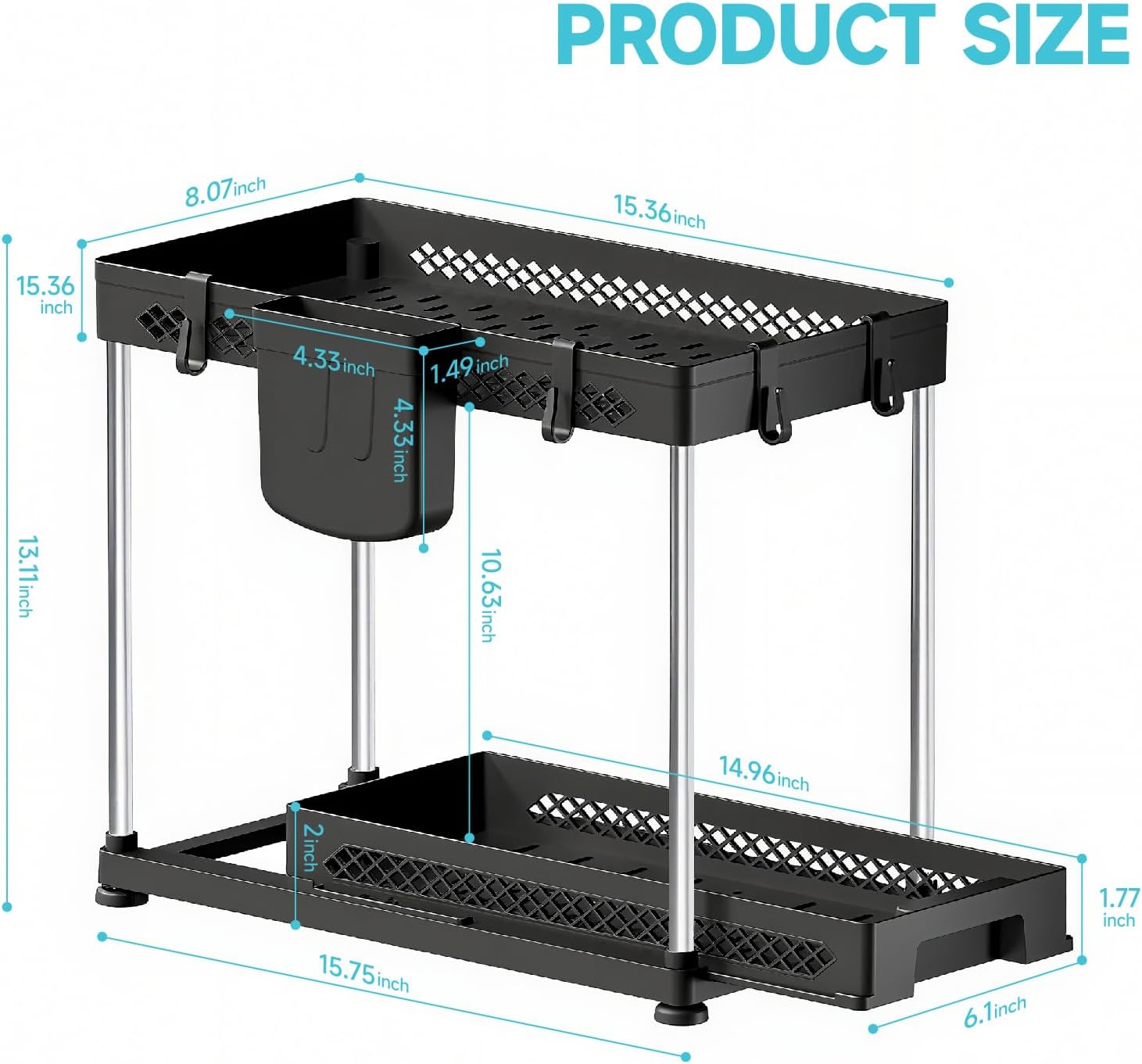 - DOUBLE YOUR CABINET SPACE: Designed with a larger capacity (15.35" x 8.07" x 13.11") and including extra hooks and removable hanging cups, this under kitchen sink organizer neatly stores all your essentials. (Pro tip: Be sure to measure your cabinet interior before purchase!)