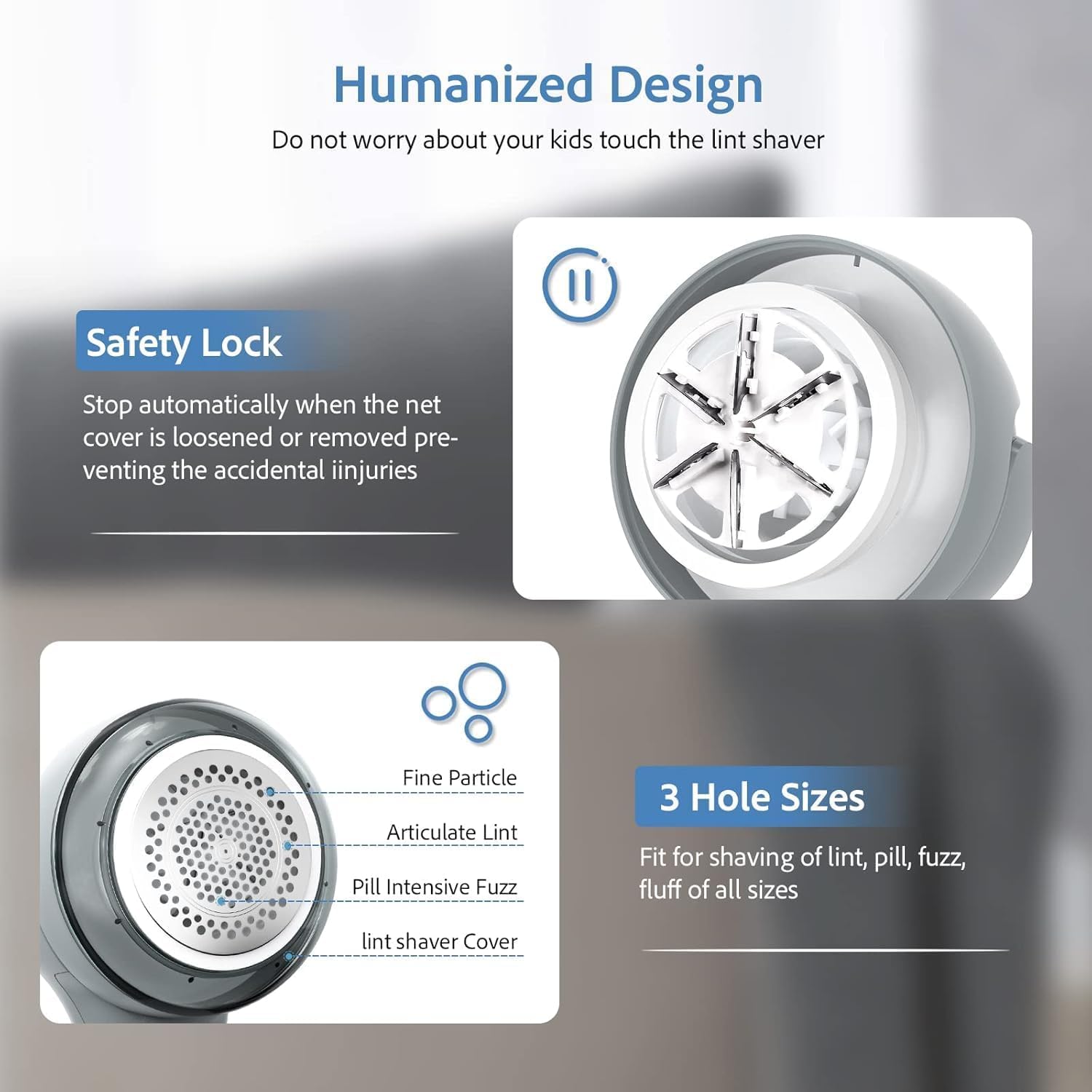 - Powerful Fabric Shaver for Clothing : Our electric fabric shaver comes with 2 speed settings, up to 9000RPM. Firstly, the mesh cover of this fabric shaver for furniture has 3 sizes of holes, which can quickly clean up different sizes lint, pilling, fuzz, pill . Secondly, compared to the traditional 3-leaf blades, we equip with 3pcs rust-proof 6-leaf blades, which can greatly improve the working efficiency of the rechargeable fabric shaver and meet the needs of all fabric surfaces.