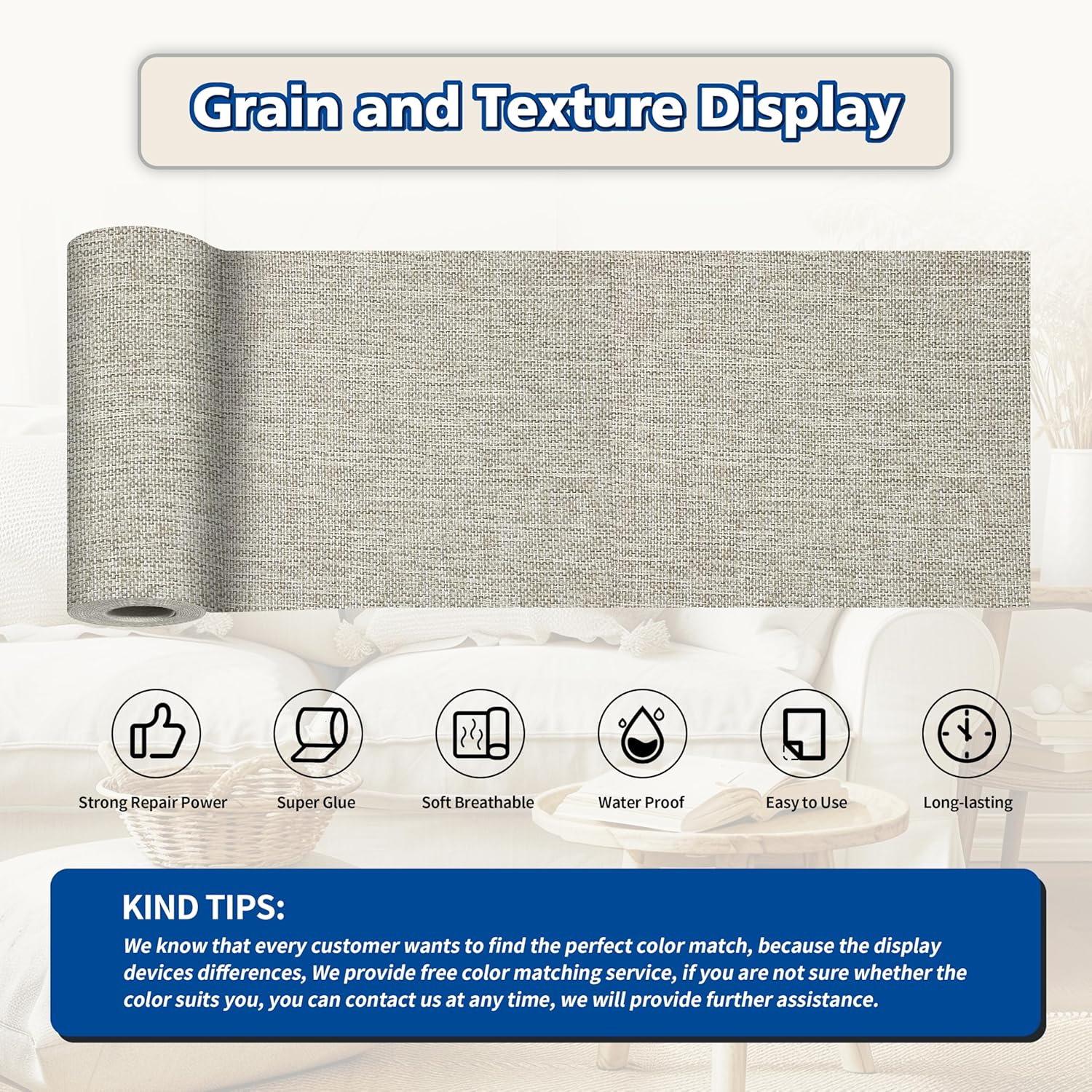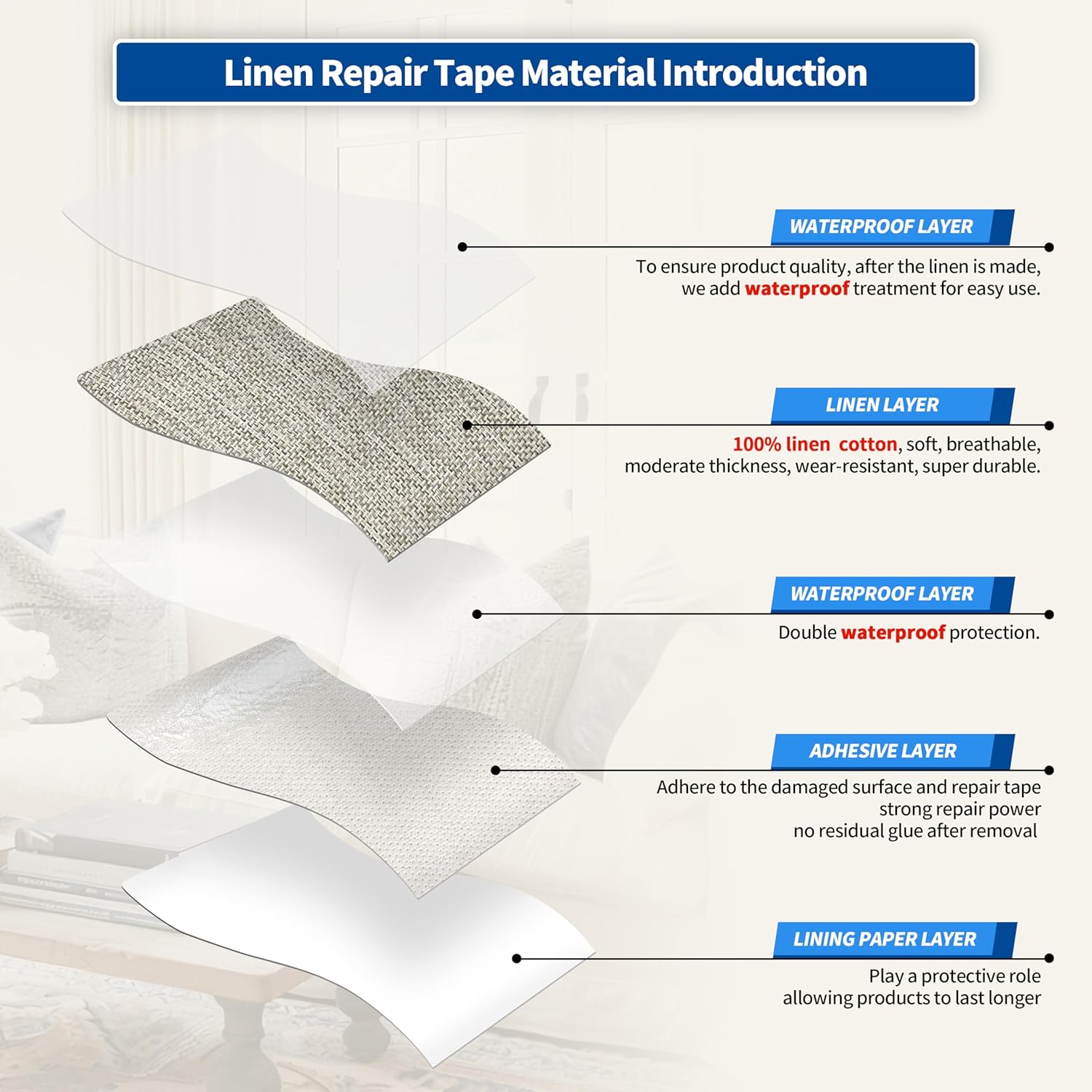 - Easy Application: Clean the damaged area, cut to the appropriate size, peel off the backing paper, and stick it to the damaged area. It only takes a few seconds to complete, and the repair effect is natural and tidy. Suitable for repairing linen products such as sofas, curtains, cushions, furniture, interior decorative fabrics, etc.