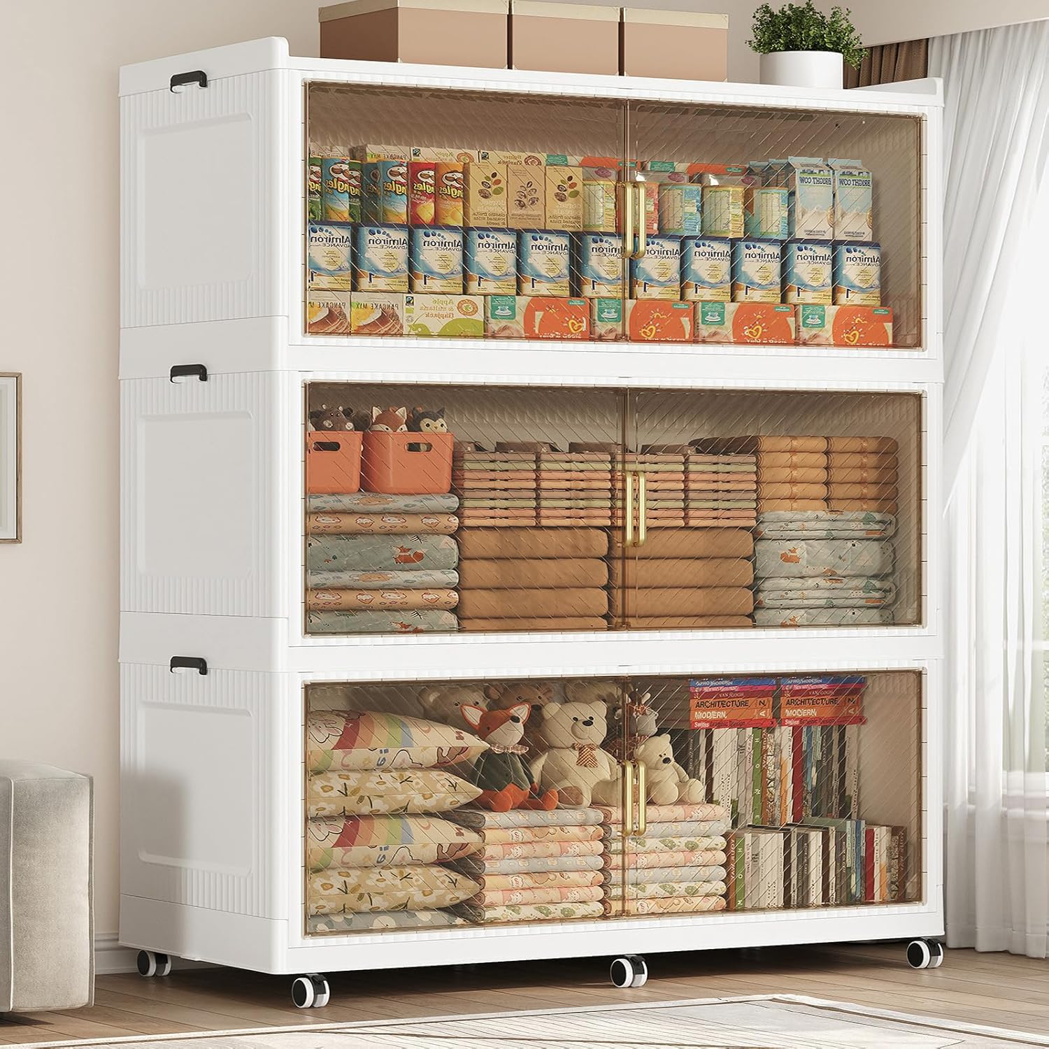 240GAL Extra Large Storage Bins with Lid, 960QT Collapsible Organizer with Wheels, Stackable Closet Cabinet with Doors, Folding Storage Containers for Home, Office, Dorm, 3Pack White