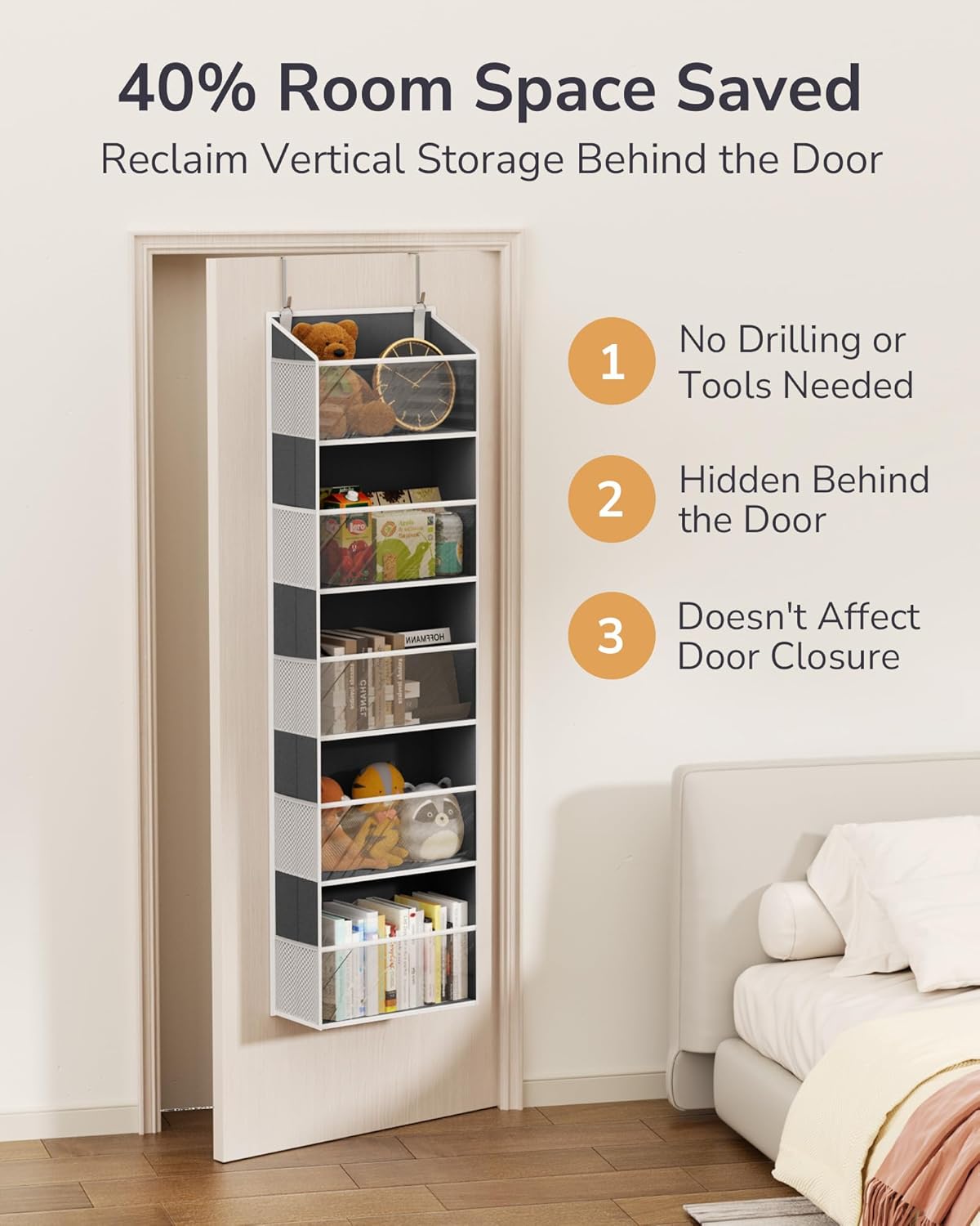 ULG 1-Pack Over Door Organizer with 5 Large Pockets 10 Mesh Side Pockets, 44 lbs Weight Capacity Hanging Storage Organizer with Clear Window for Bedroom Bathroom, RV, Clear Dark Grey