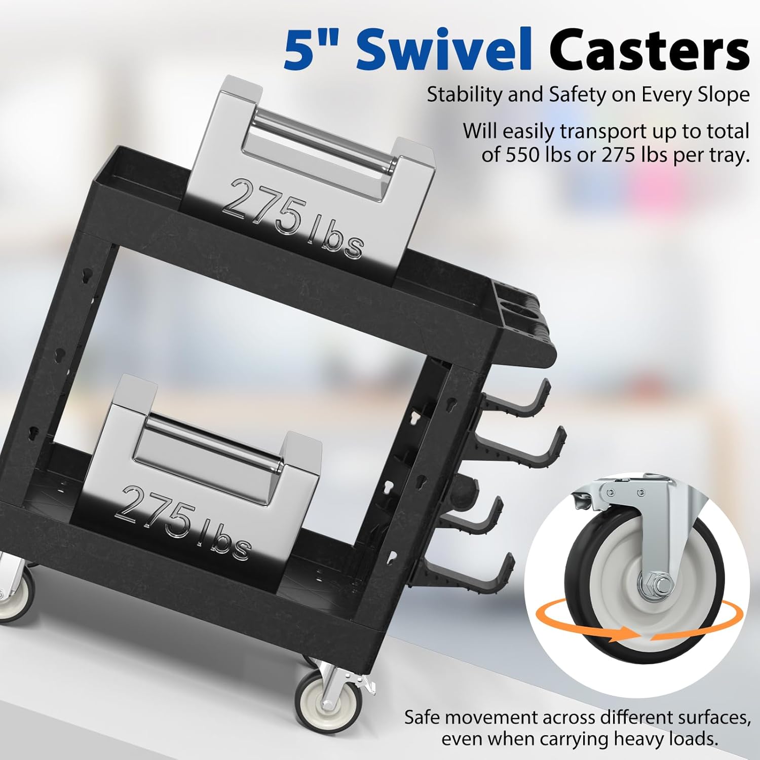 Heavy Duty Rolling Utility Cart with Wheels 2-Tier Utility Plastic Service Work Cart for Shop, Garage, Warehouse, Maintenance 550 lbs