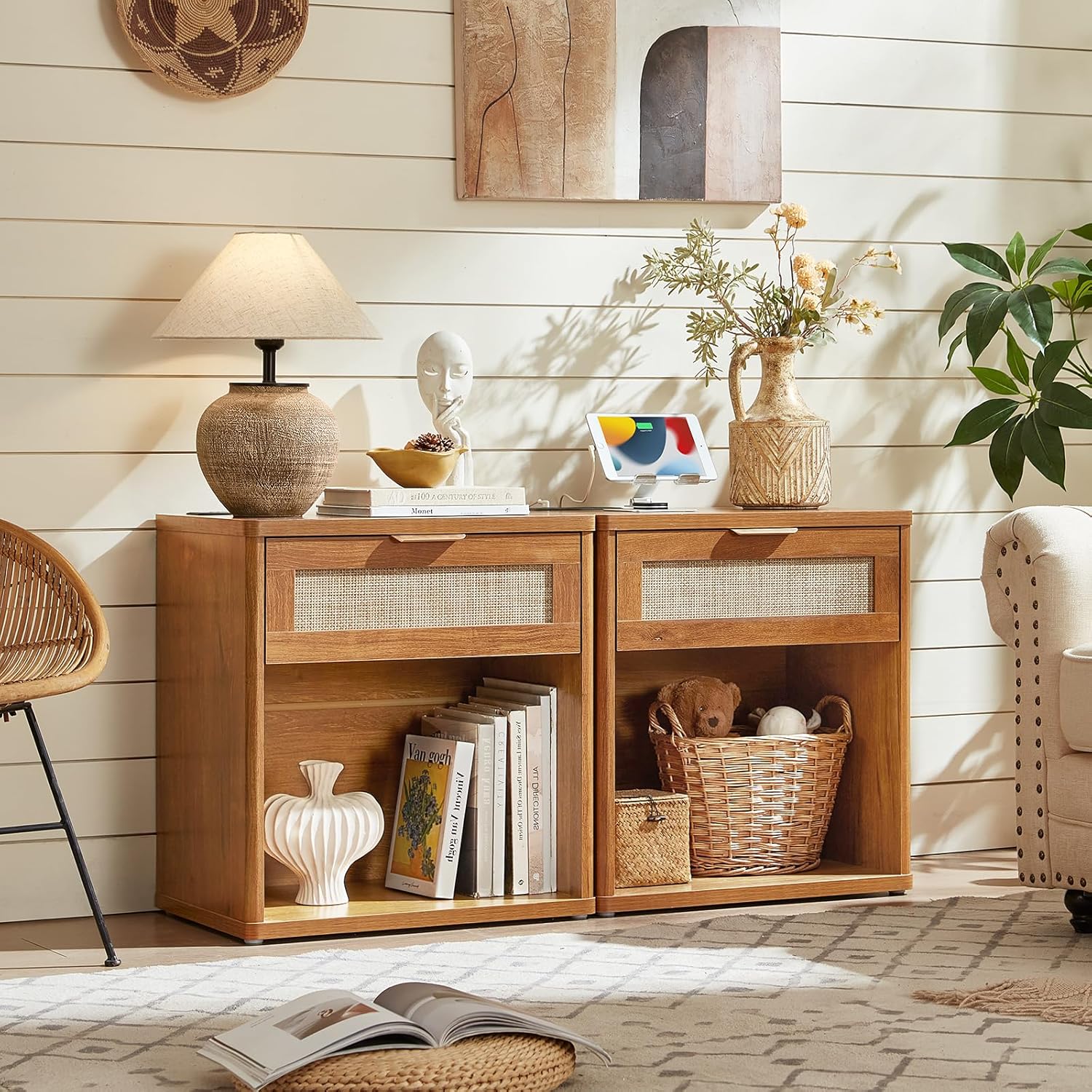 LEYAOYAO Rattan Nightstands Set of 2 with Charging Station, Natural Wood Night Stand with Drawer, 23" Wide Boho Bedside Table Open Cabinet, Bed Side Table Dresser for Bedroom, Living Room, Entrance