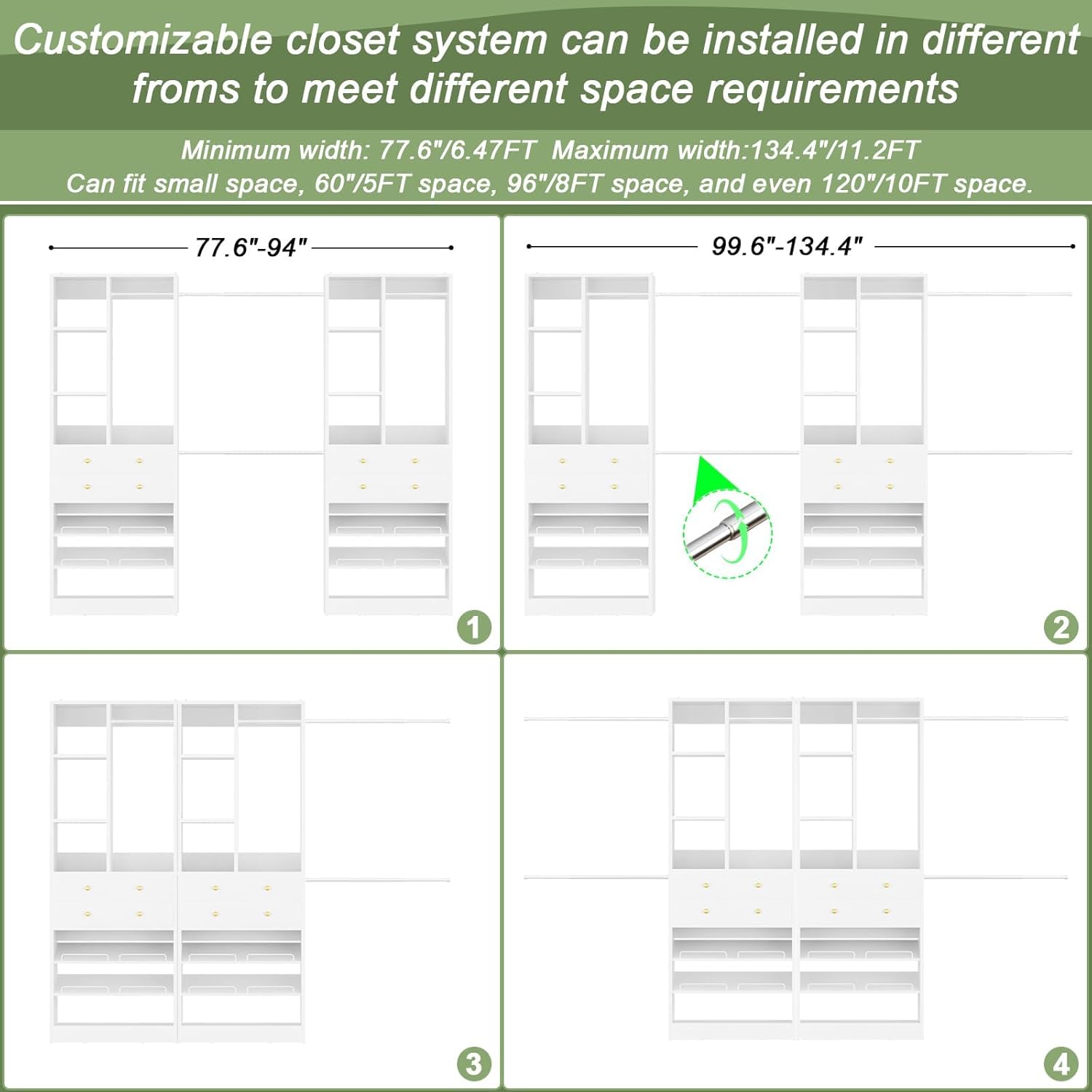 - 【Adjustable & Spacious Hanging Area】Equipped with 6 sturdy expandable hanging rods, this closet system offers ample space to organize your clothes. The rod length is adjustable, allowing for a flexible fit in closet spaces ranging from 77.6" to 134.4", making it perfect for various room sizes