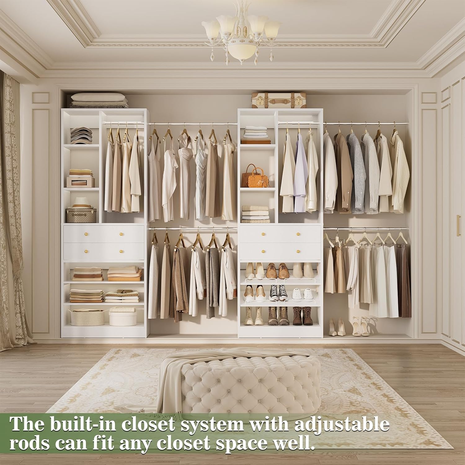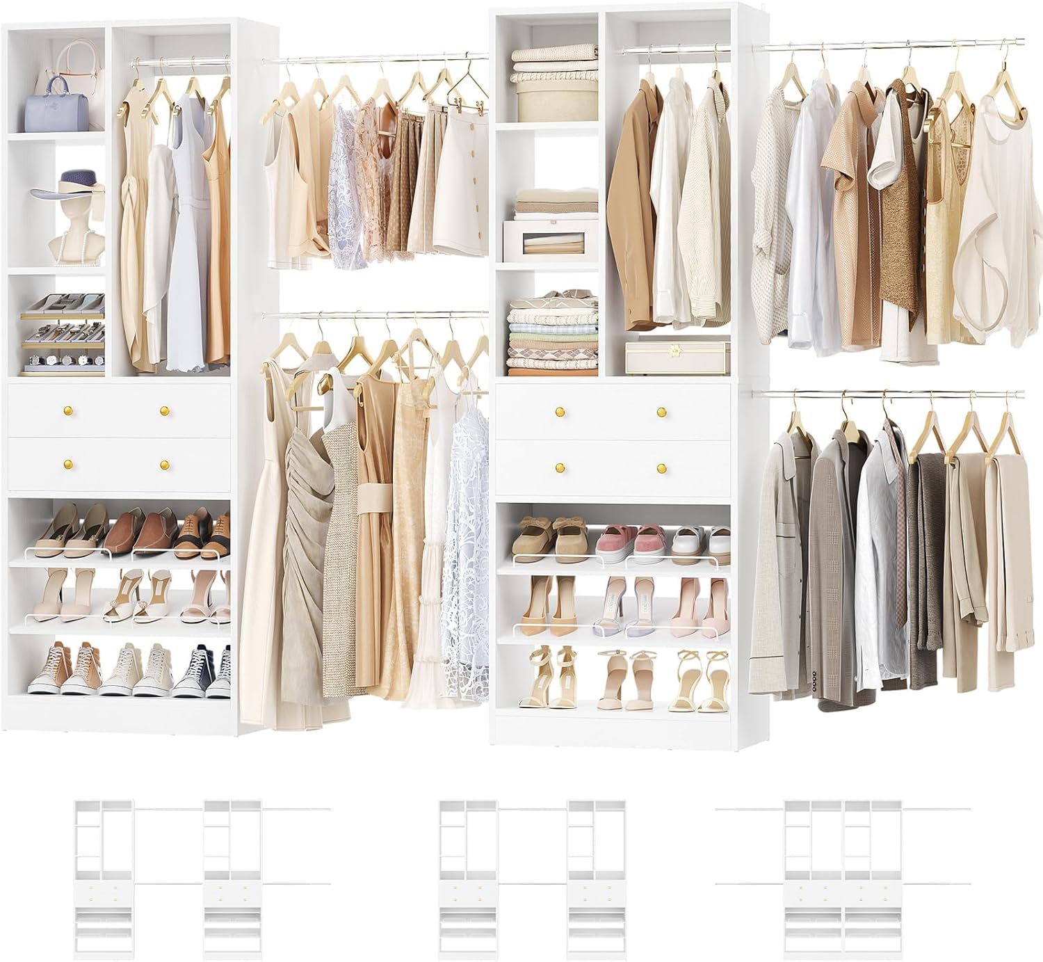 Closet System, Up to 134"/11.2 FT Closet Organizer with 4 Wooden Drawers and Shelves, Walk-in Closet System with 6 Hanging Rods, Built-in Closet Can Fit 96"/8FT, 120"/10FT, White