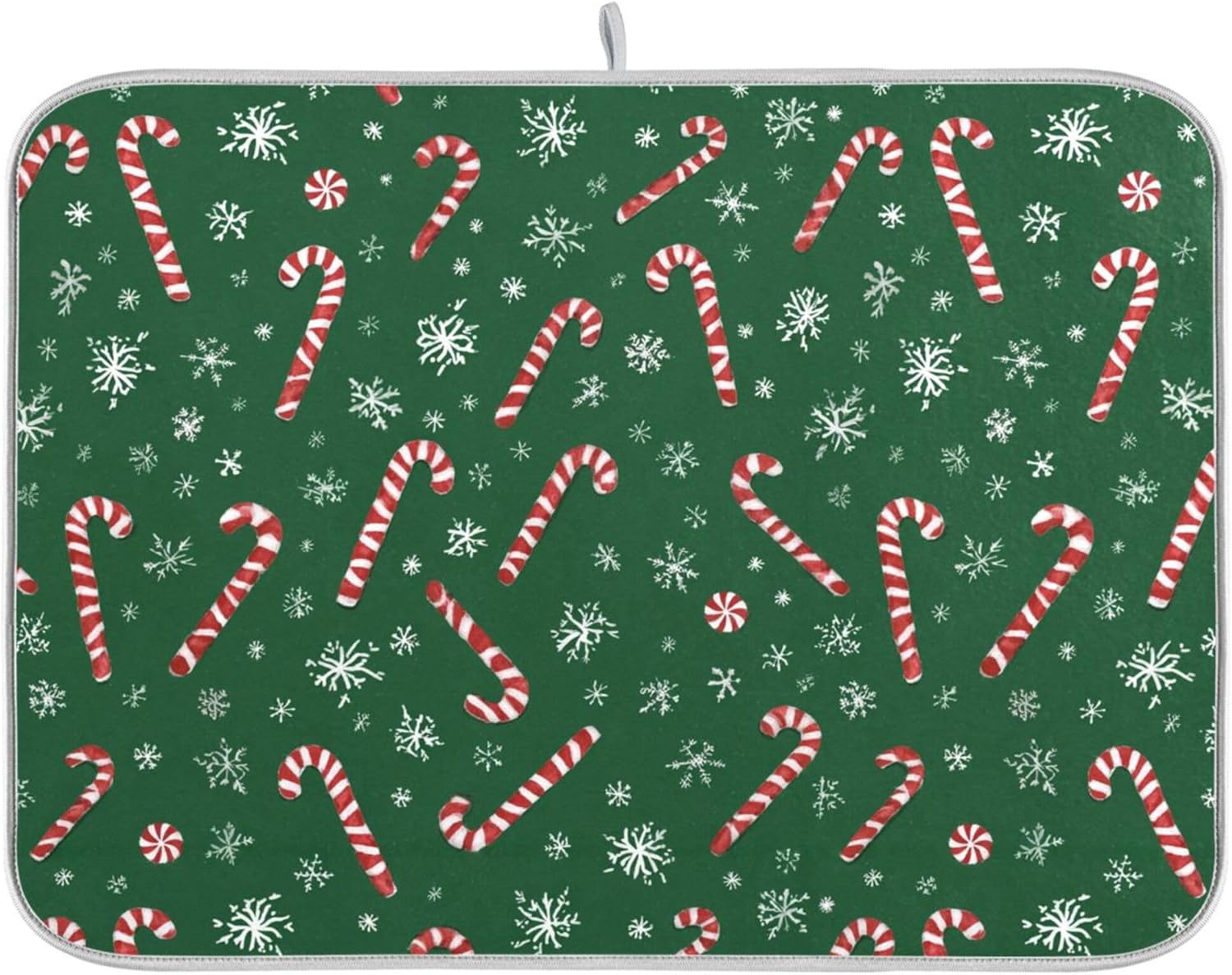 Christmas Candy Cane Dish Drying Mat for Kitchen Countertop 18x24 Winter Snowflake Green Xmas Large Drying Mat Reusable Quick Dry Dish Sink Mats Easy Clean Decorative Essentials