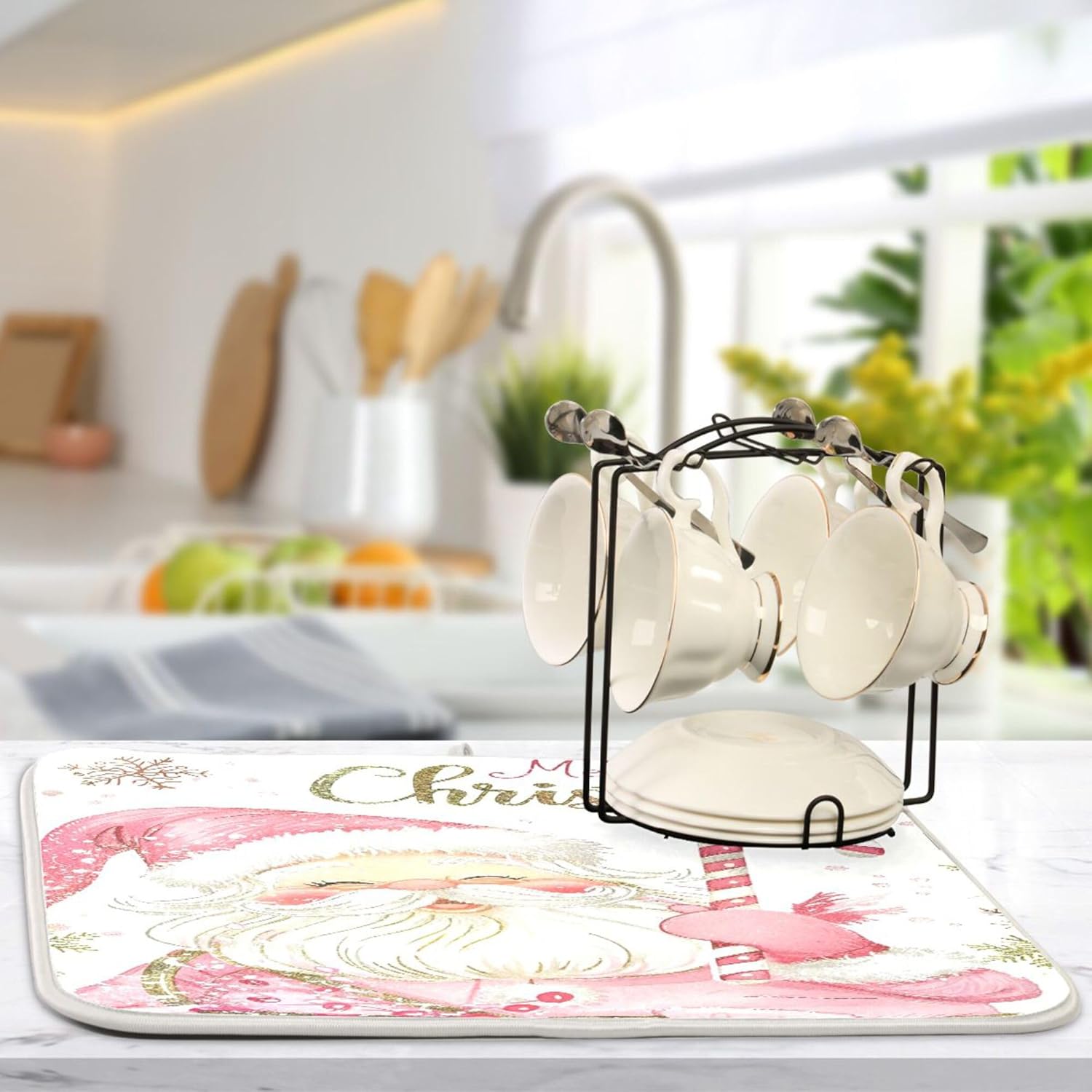 Christmas Santa Claus Pink Dish Drying Mat for Kitchen Countertop 18x24 Xmas Candy Cane Snowflake Large Drying Mat Reusable Quick Dry Dish Sink Mats Easy Clean Decorative Essentials