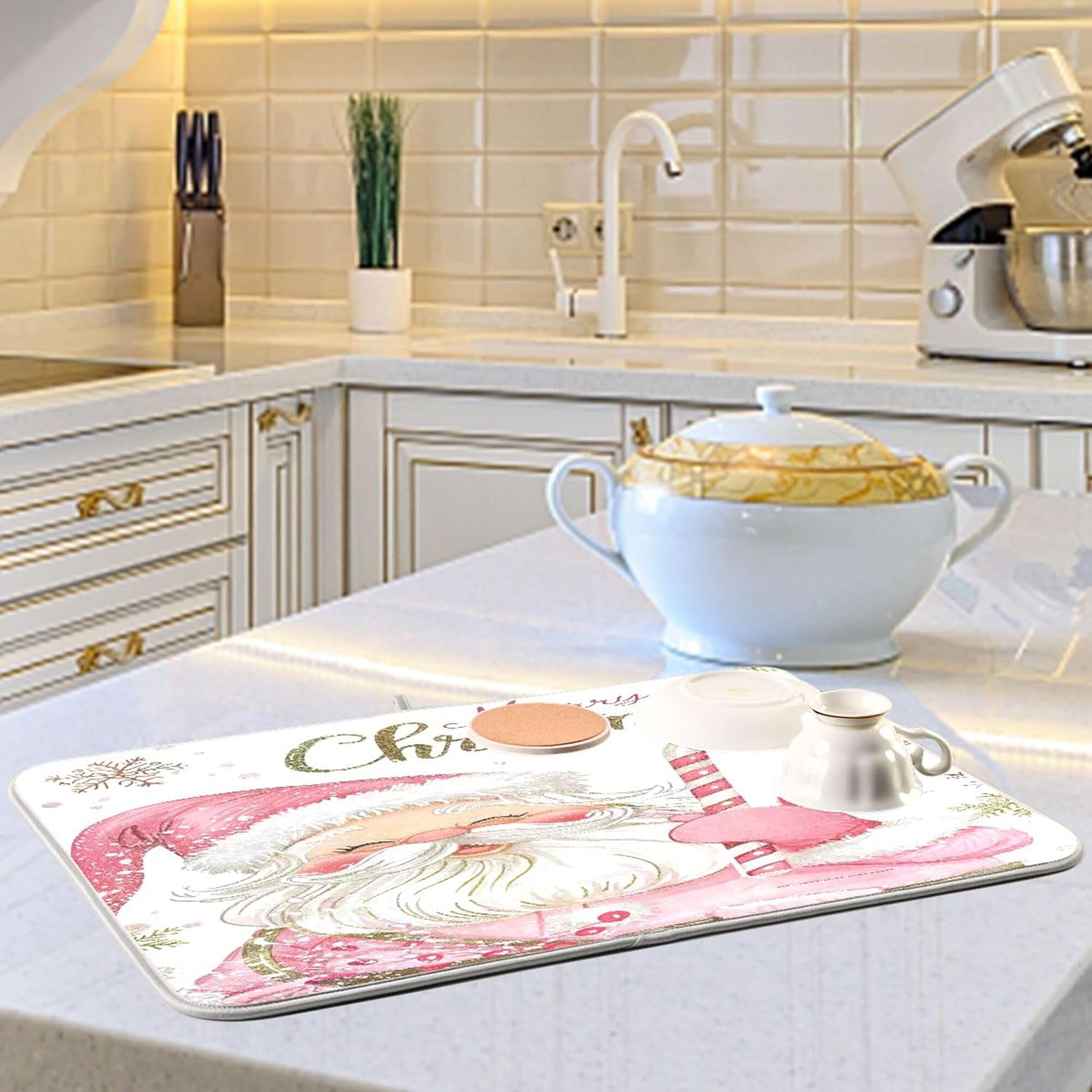 Christmas Santa Claus Pink Dish Drying Mat for Kitchen Countertop 16x18 Xmas Candy Cane Snowflake Small Drying Mat Reusable Quick Dry Dish Sink Mats Easy Clean Decorative Essentials