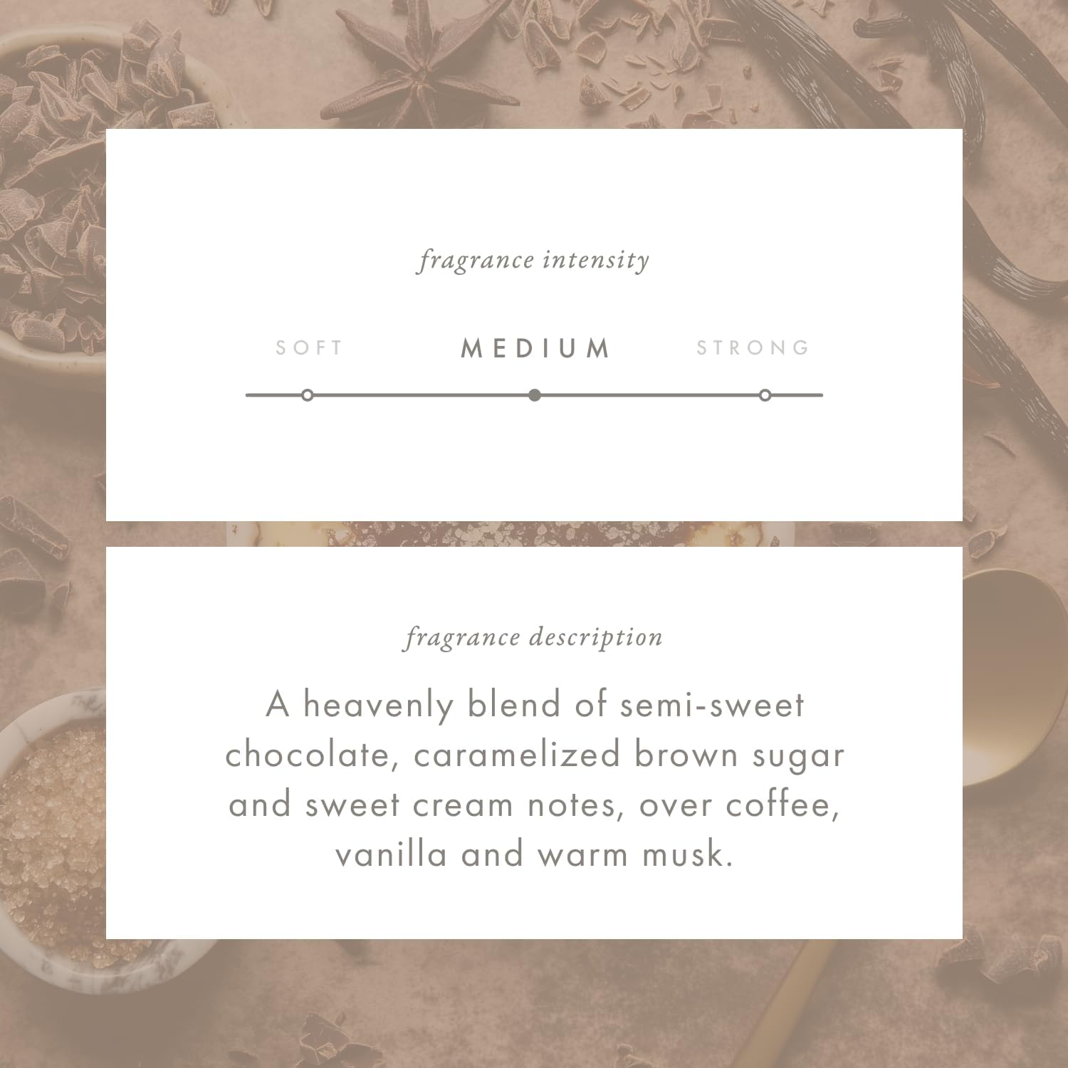 - Savory & Gourmand Edible Scent – A medium-strength fragrance that layers semi-sweet chocolate, caramelized brown sugar, and sweet cream over rich coffee, vanilla, and warm musk. Decadent top notes of chocolate chips, brown sugar, and warm milk blend into a heart of cookie dough, cocoa, and coffee nuances, finishing with a smooth base of vanilla and musk. From the Edible–Vanilla family, it smells like cracking into a Mocha Crème Brûlée on a special night out.