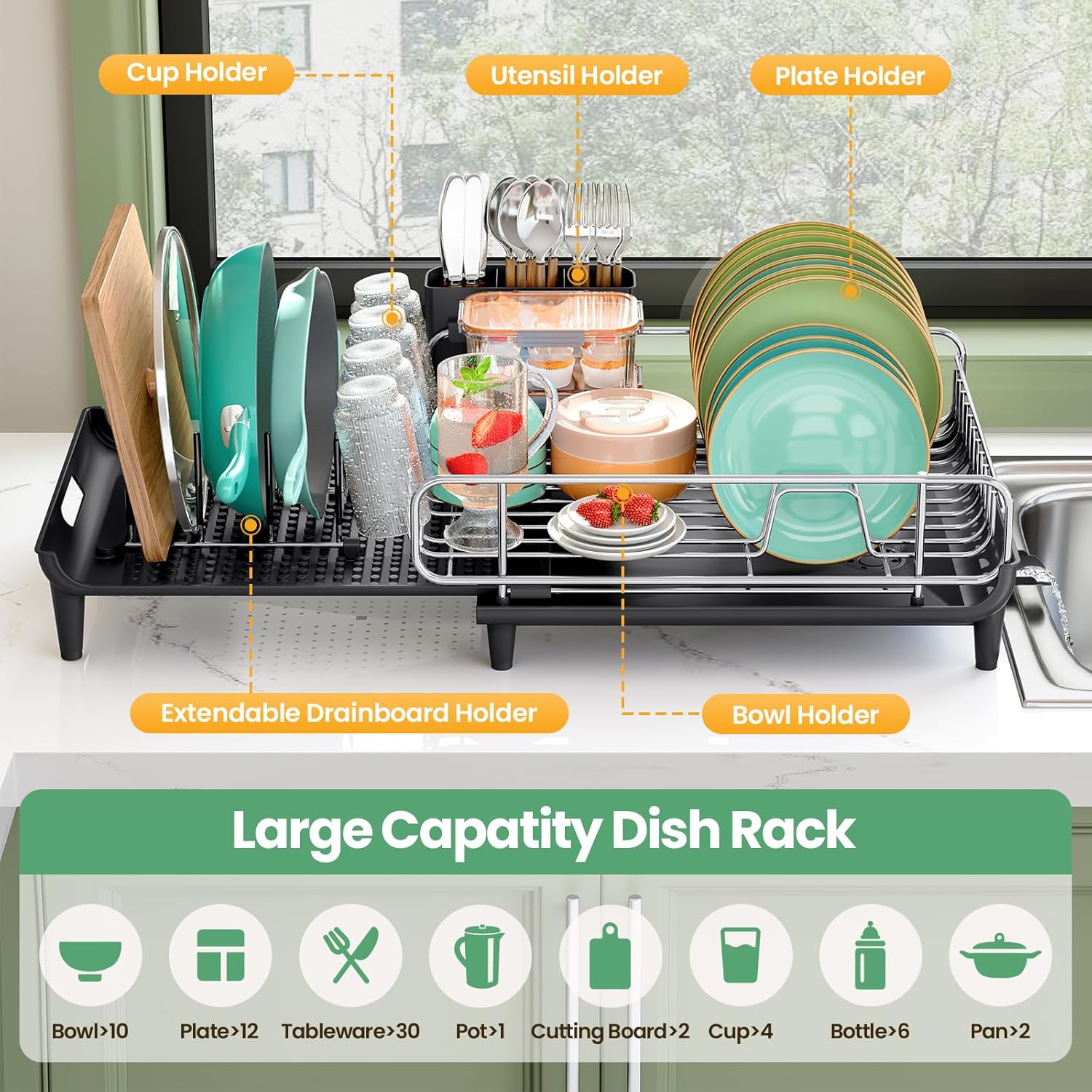 Expandable Dish Drying Rack, Foldable Dish Rack for Kitchen Counter, Stainless Steel Collapsible Dish Drainer Racks with Cutlery Holder, Black